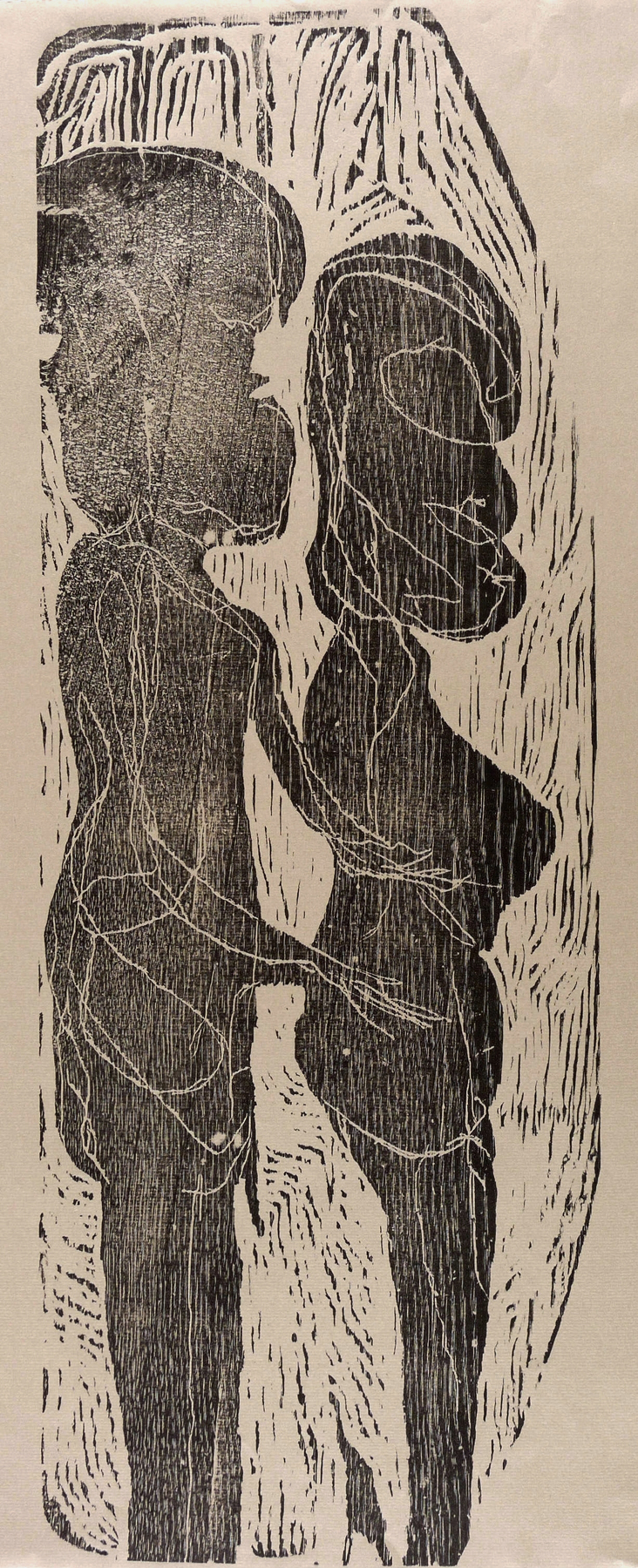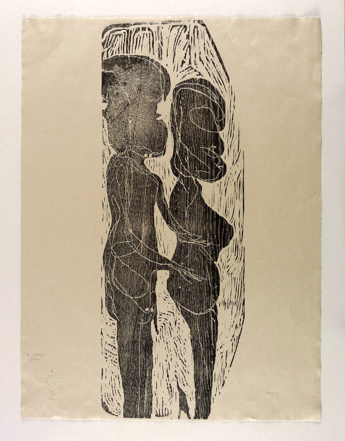 1976. Holzschnitt, in Schwarz, auf hellgrau getöntem Ingres-Bütten. – Originale Künstlergrafik, von Gerhard Altenbourg. – Auflage Exemplar Nr. 9/14. – 63,6 x 23,0 cm (Darstellung / Druckstock), 65 x 49 cm (Blatt).
