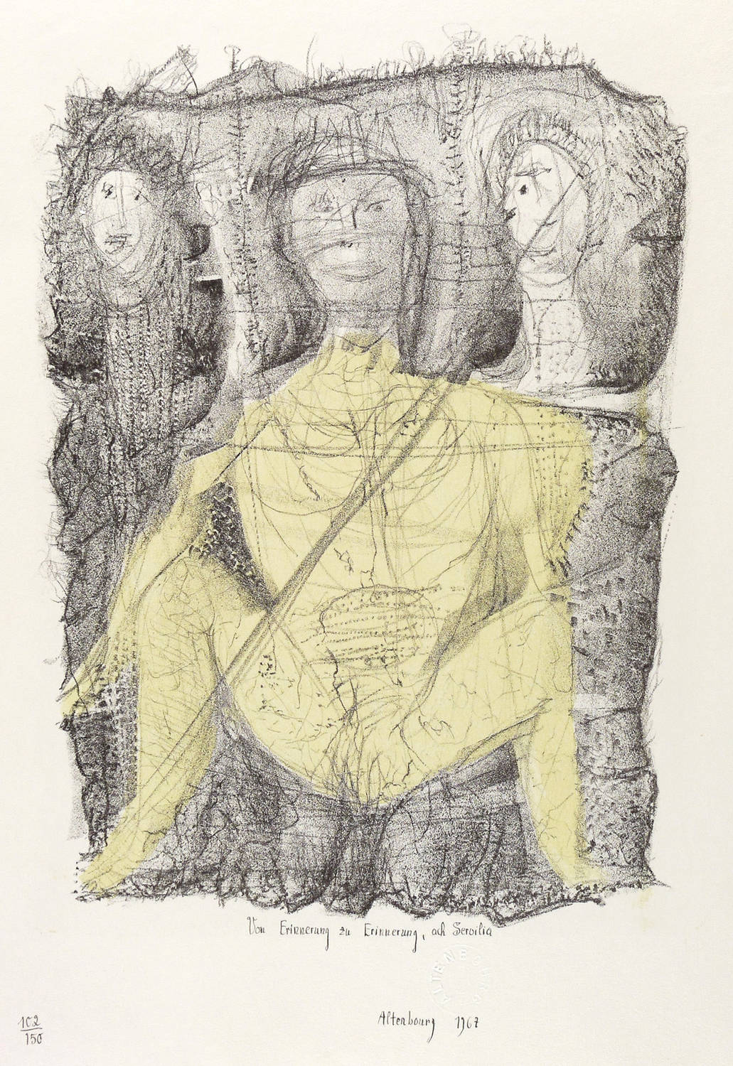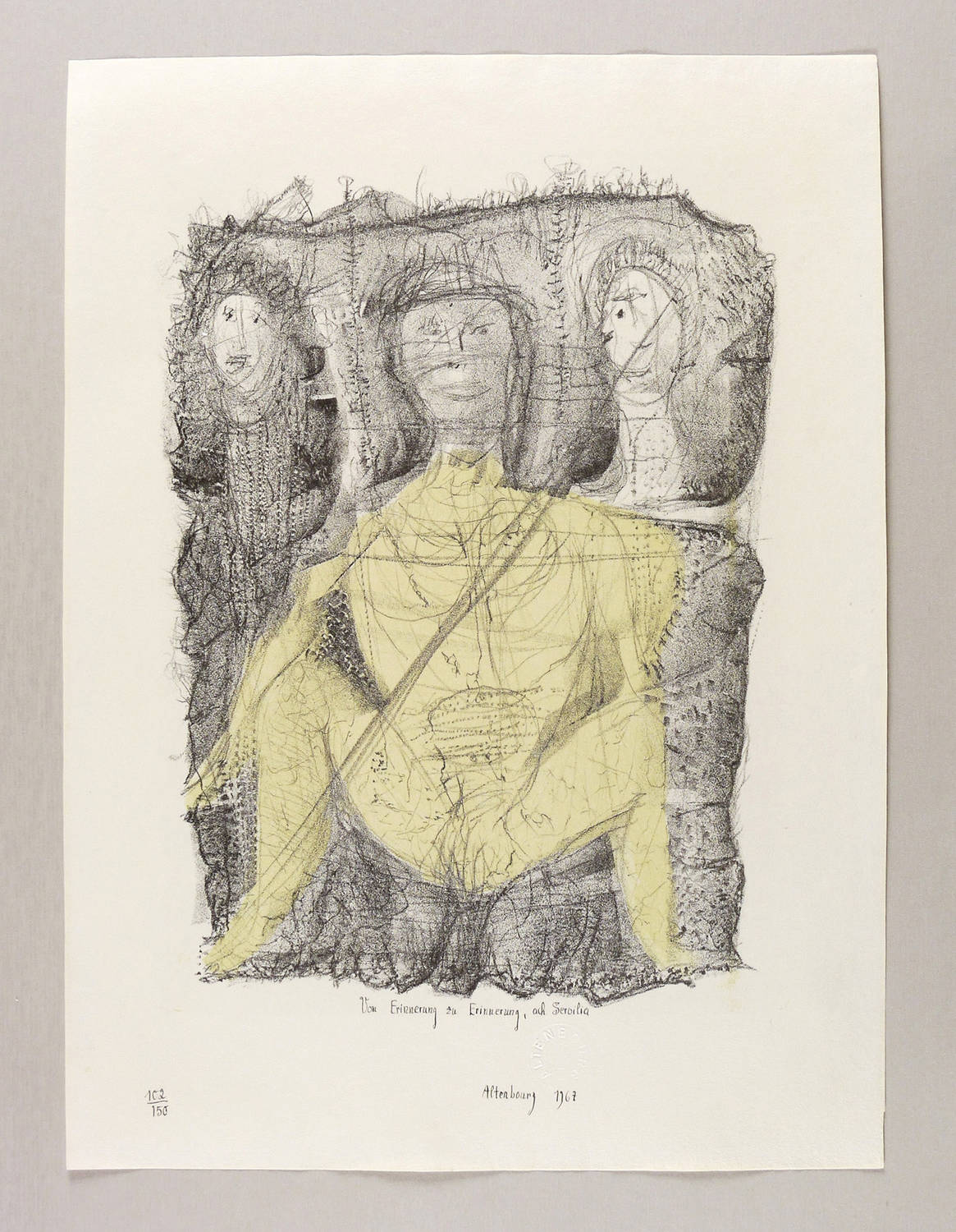 1967. Farblithografie / Kreide- & Pinsellithografie, in Schwarz & Gelb, auf feinstem hellgelbem Velin. – Originale Künstlergrafik, von Gerhard Altenbourg. – Auflage Exemplar Nr. 102/150. – 41 x 30 cm (Blatt), 31,2 x 22,7 cm (Darstellung / Druckbild).