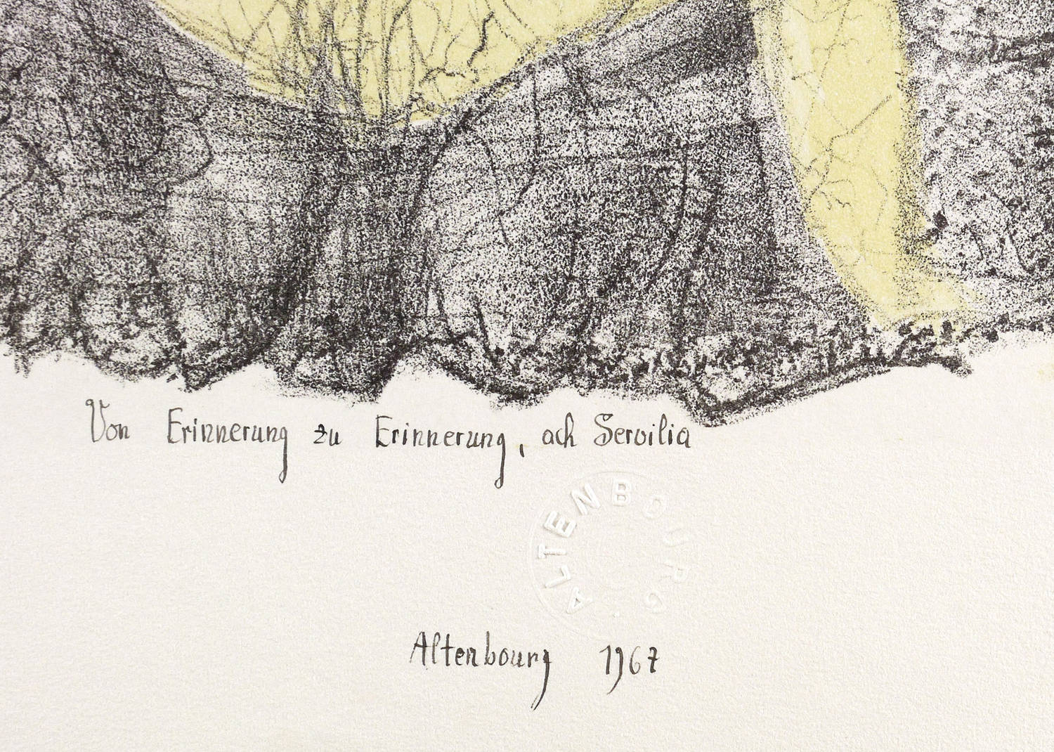Janda L 122 II a. – Unterhalb in schwarzer Tusche signiert und datiert: ″Altenbourg 1967″. Darüber Titel und Trockenstempel des Künstlers. Links unten Auflagenbezeichnung. – Tadellos. Sehr guter Zustand.