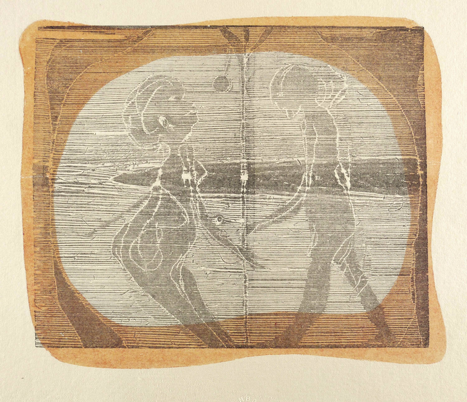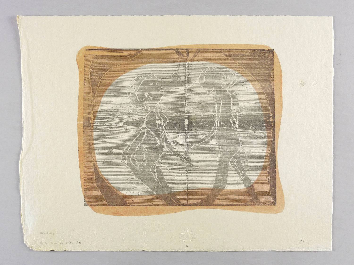 1978. Farbholzschnitt, in Grau & Hellrot, auf gelbem Hosho-Büttenkarton. – Originale Künstlergrafik, von Gerhard Altenbourg. – Auflage Exemplar Nr. 8/30. – 25,6 x 31,1 cm (Darstellung / Druckstock), 36 x 47 cm (Blatt).