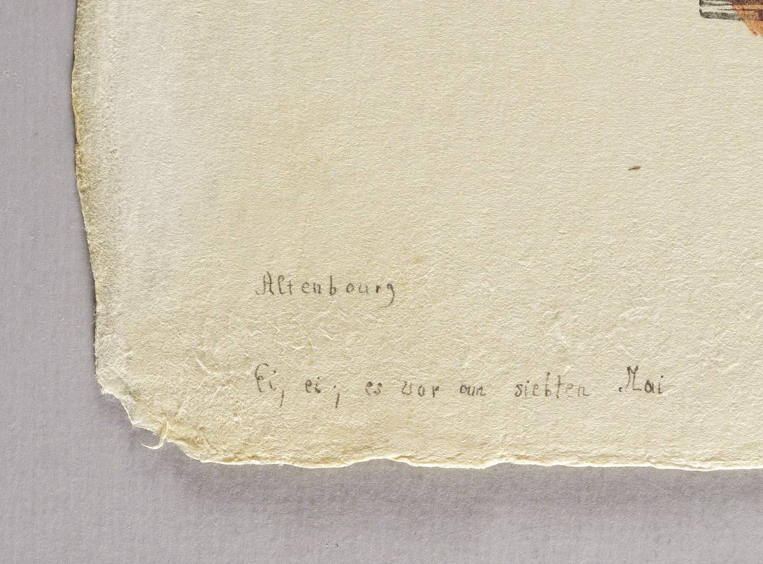 Janda H 207 4 (von 11). – Links unten in grauer Tusche signiert: ″Altenbourg″. Darunter Titel: ″Ei, ei, es war am siebten Mai″. Unten mittig Prägestempel und Monogramm des Künstlers. Links oben Auflagenbezeichnung und unten Jahr. – 1 von 20 Exemplaren dieser Auflage auf kräftigem Hosho paper, die anderen auf Hahnemühle und Japan. – Papier unscheinbar gegilbt. Sonst ohne Altersspuren. Guter Zustand.