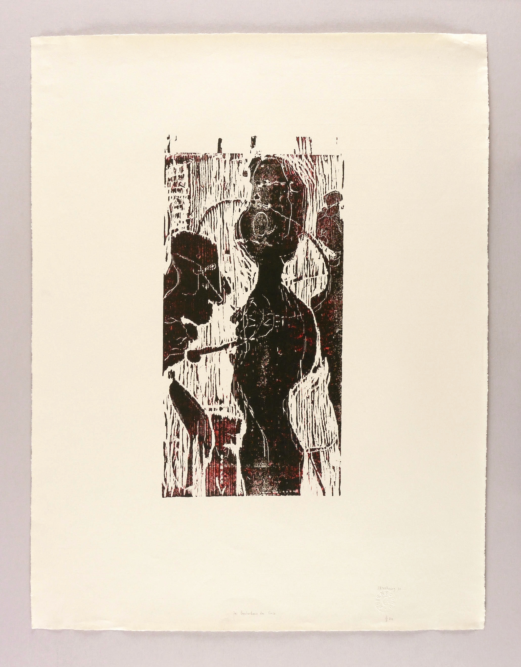 1970. Farbholzschnitt, in Schwarz & Rot, auf leichtem chamois Hahnemühle. – Originale Künstlergrafik, von Gerhard Altenbourg. – Auflage Exemplar Nr. 2/5. – 38,2 x 19,1 cm (Darstellung / Druckstock), 64 x 49 cm (Blatt).