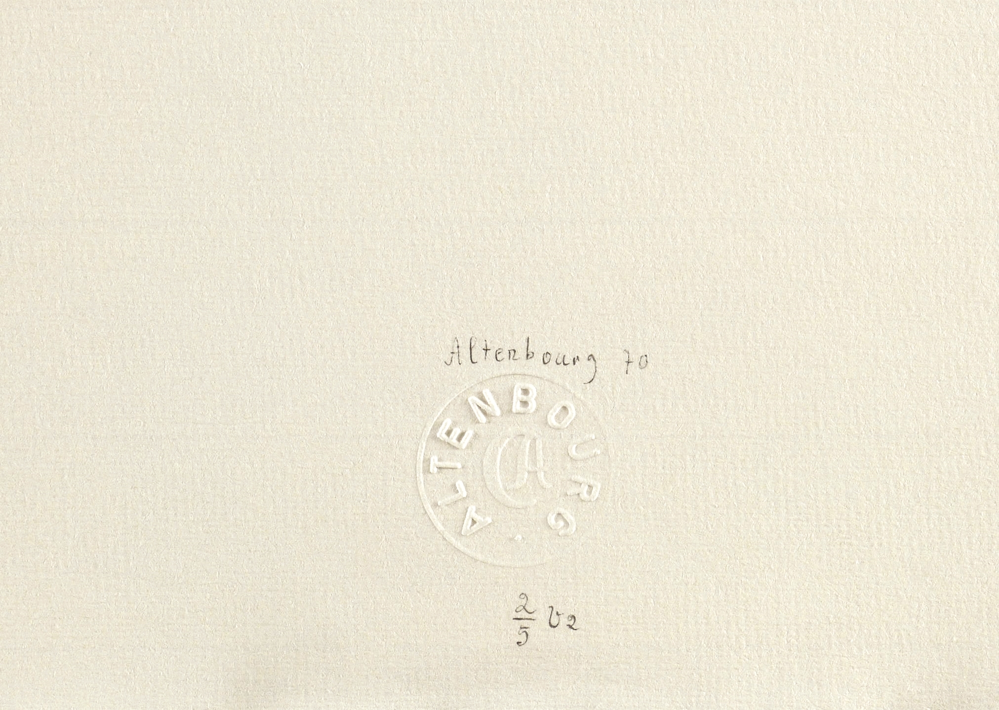 Janda H 150 1. – Rechts unten in grauer Tusche signiert und datiert: ″Altenbourg 1970″. Dazu Prägestempel des Künstlers und Auflagenbezeichnung: ″2/5 V2″. Mittig im unteren Blattrand Titel: ″Im Zauberkreis der Circe″. Wasserzeichen der Hahnemühle. – Schönes unbeschnittenes Exemplar. Sehr guter Zustand.