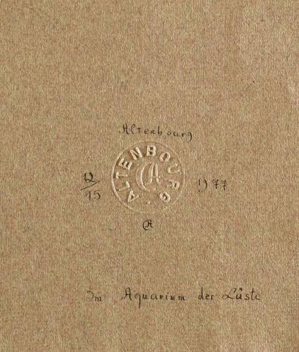 Janda H 201 B 2 (von 2). – Links unten in Feder und Tusche signiert: ″Altenbourg″. Darunter Prägestempel und Monogramm des Künstlers. Davon links und rechts Auflagenbezeichnung und Jahr: ″12/15 // 1977″. In der rechten unteren Blattecke Titel: ″Im Aquarium der Lüste″. – Keine Mängel. Tadellos. Sehr guter Zustand.