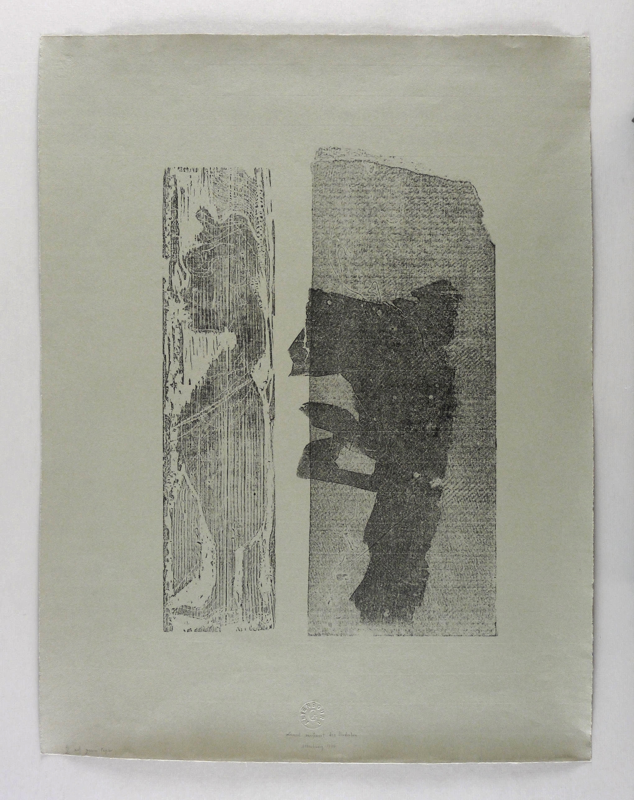 1970. Holzschnitt, in Schwarz, auf grauem Hahnemühle. – Originale Künstlergrafik, von Gerhard Altenbourg. – Auflage Exemplar Nr. 2/2. – 42,7 x 29,3 cm (Darstellung / Druckstock), 64 x 49 cm (Blatt).