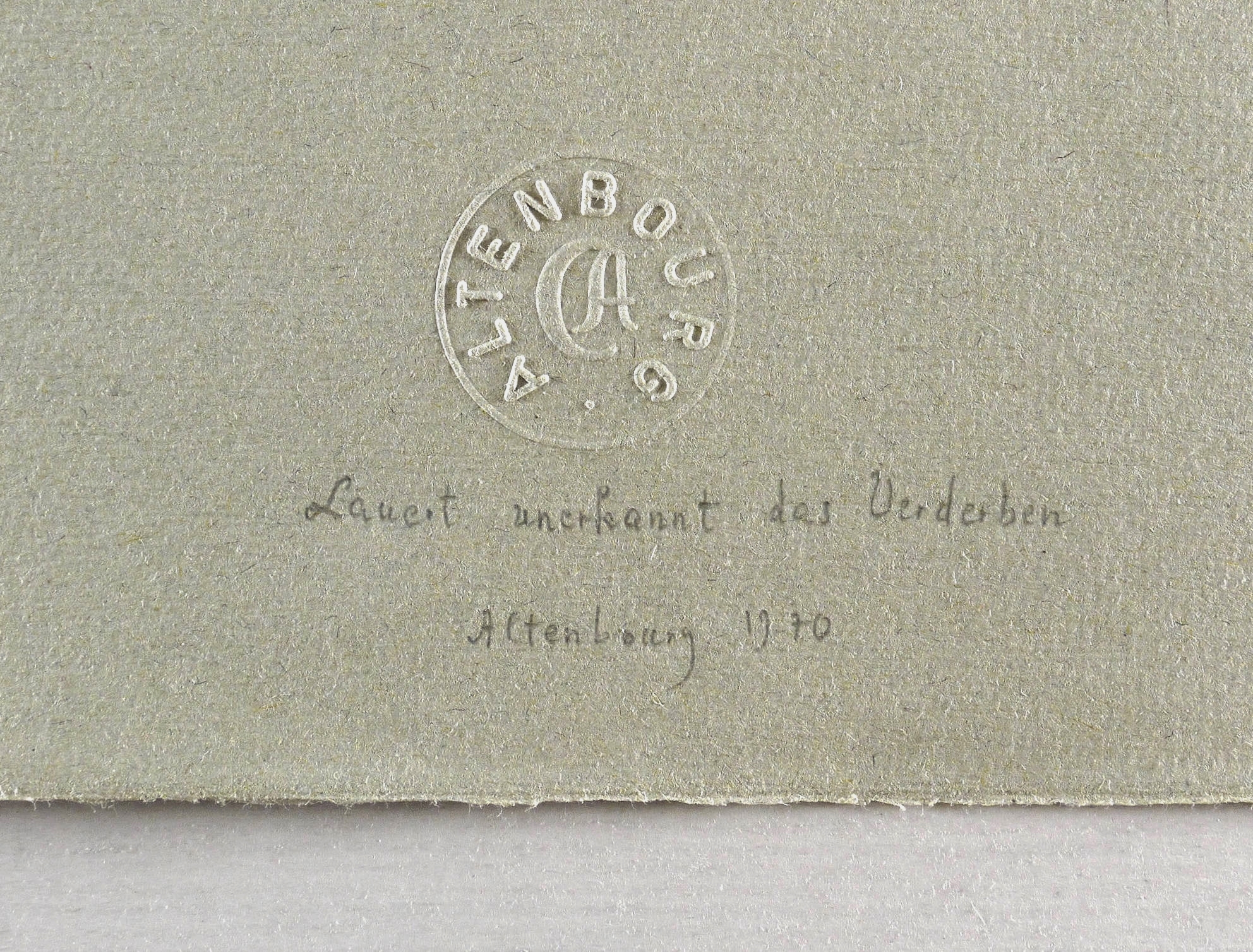 Janda H 144 10 a. – Rechts unten in grauer Tusche signiert und datiert: ″Altenbourg 1970″. Darüber Titel: ″Lauert unerkannt das Verderben″. Dazu Prägestempel des Künstlers. In der linken unteren Blattecke Auflagenbezeichnung: ″2/2 auf grauem Papier″. Wasserzeichen der Hahnemühle. – Schönes unbeschnittenes Exemplar. Sehr guter Zustand.