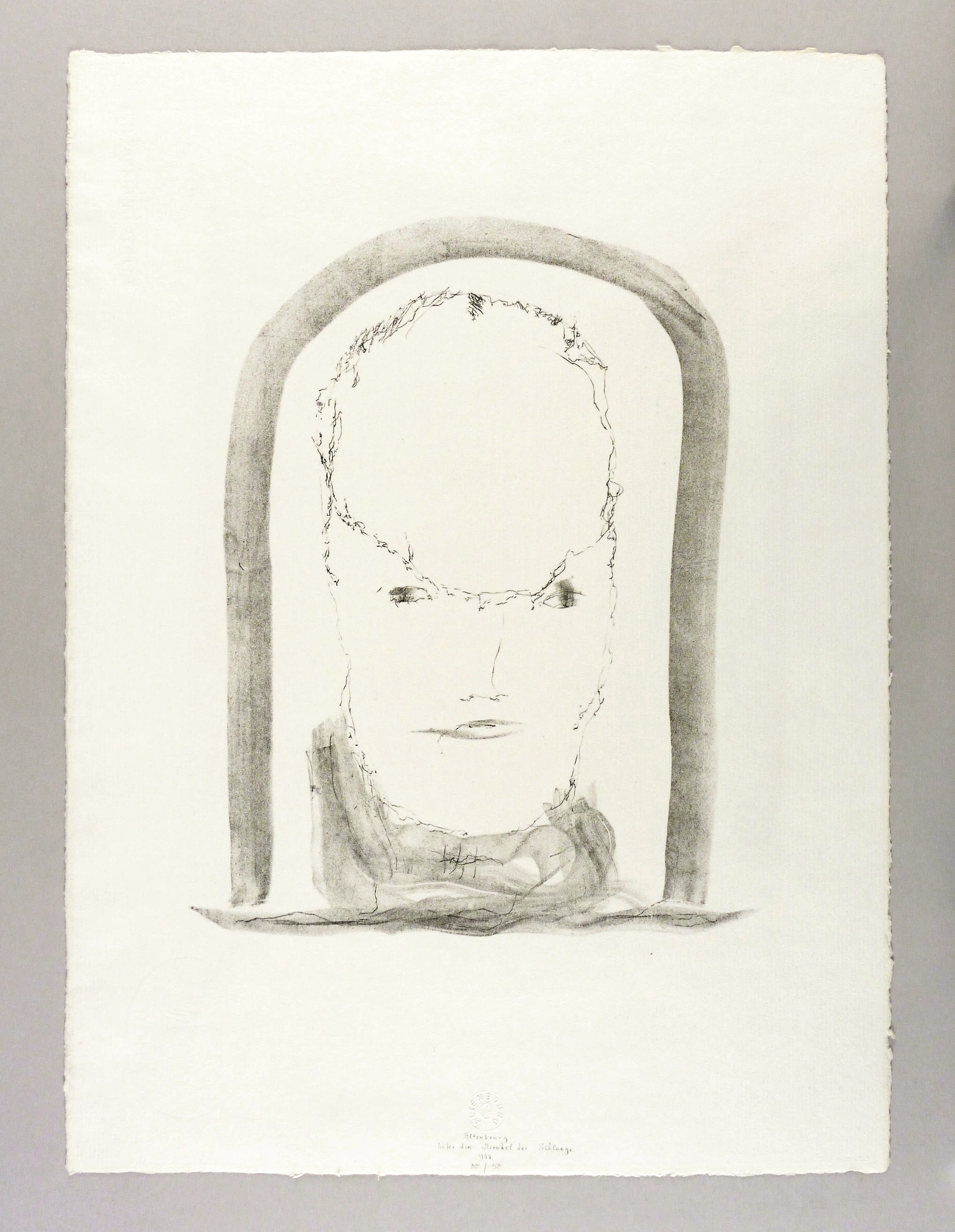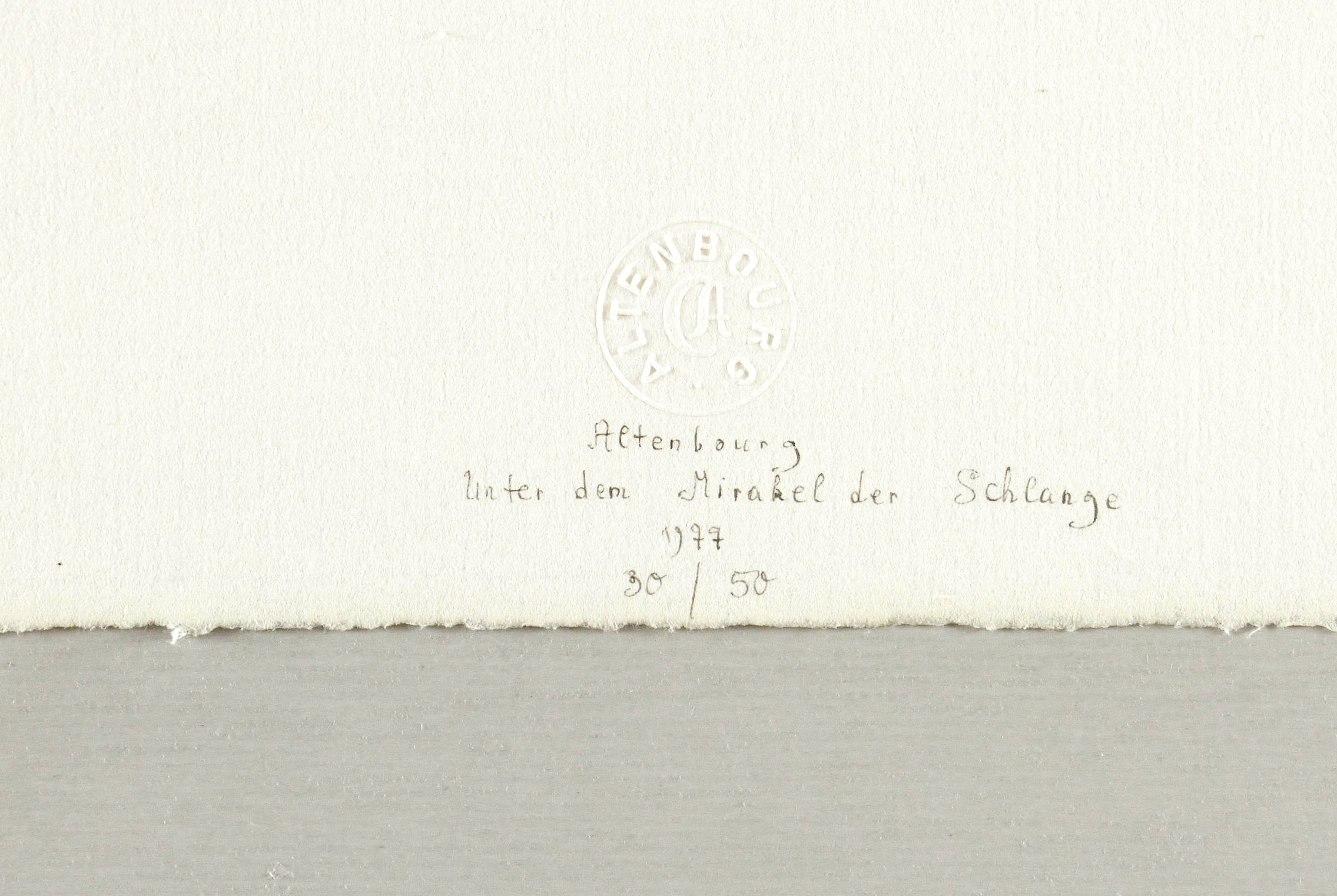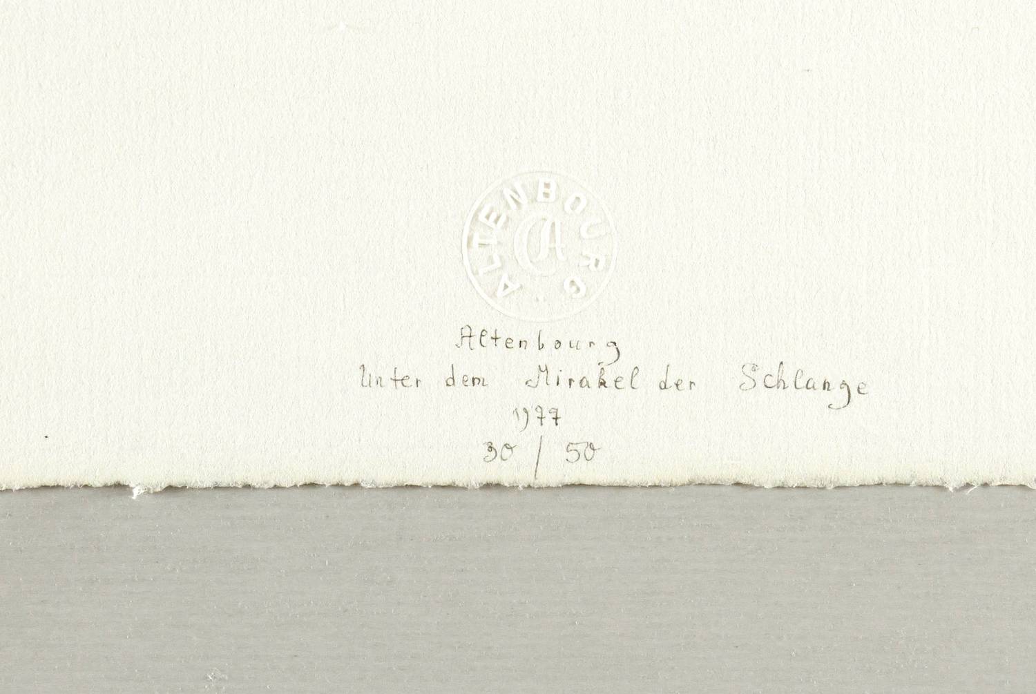 Janda L 165 I 5. – Unterhalb in grauer Feder signiert: ″Altenbourg″. Darüber Trockenstempel des Künstlers. Darunter Titel: ″Unter dem Mirakel der Schlange″. Weiter Jahr und Auflagenbezeichnung: ″1977 / 30/50″. Wasserzeichen von C.M. Fabriano Italia. – Tadellos erhalten. Hervorragender Zustand.