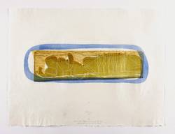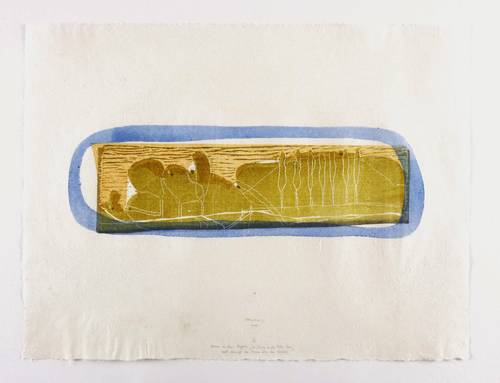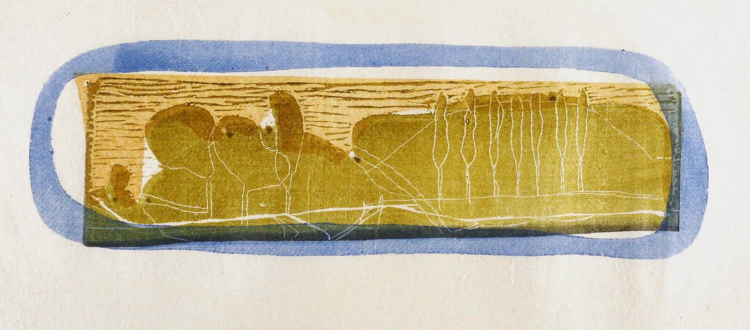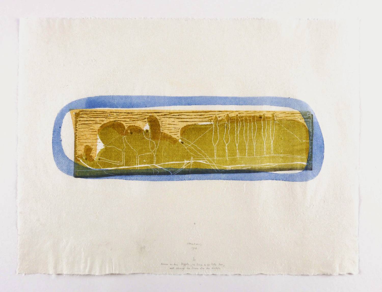 1978. Farbholzschnitt, in Olivgrün, Blau, Orange & Grau, auf rauem hellchamois Japan. – Originale Künstlergrafik, von Gerhard Altenbourg. – Auflage Exemplar Nr. 6/30. – 12,8 x 39,7 cm (Darstellung / Druckstock), 38 x 50 cm (Blatt).