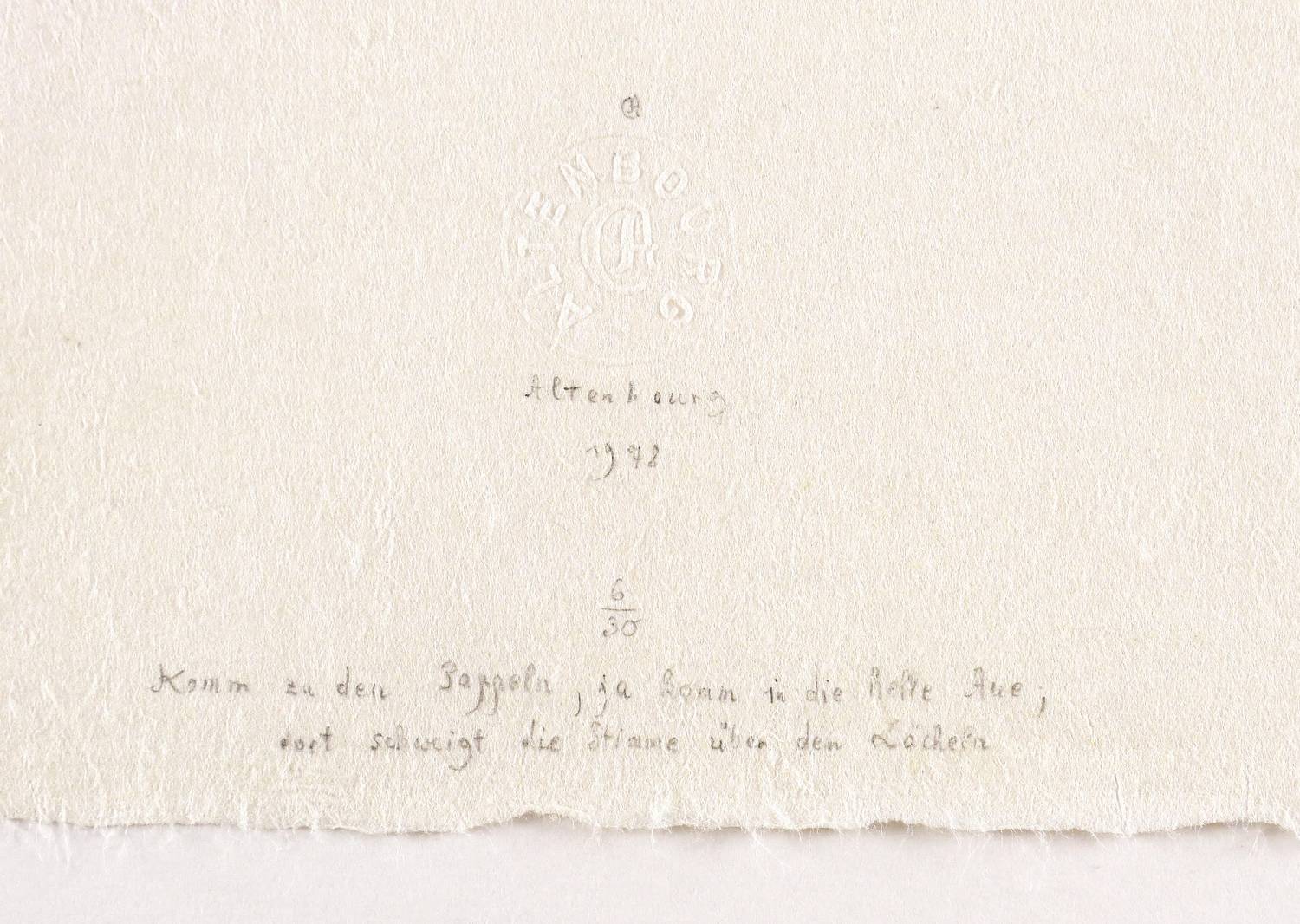 Janda H 204 IV 7 (von 10). – Unterhalb in Bleistift signiert und datiert: ″Altenbourg 1978″. Darüber Prägestempel und Monogramm des Künstlers. Darunter Auflagenbezeichnung: ″6/30″. Im unteren Blattrand dannTitel: ″Komm zu den Pappeln, ja komm in die helle Aue; / dort schweigt die Stimme über dem Lächeln″. – Sehr guter Zustand.