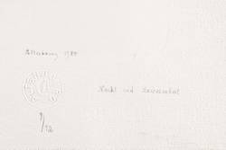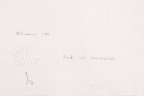 Janda L 183 II 4. – Rechts unten in schwarzer Feder signiert und datiert: ″Altenbourg 1984″. Darunter Blindstempel des Künstlers. Rechts daneben Titel: ″Nacht und Anwesenheit″. Darunter Auflagenbezeichnung: ″9/12″. Links unten Monogramm: ″GA″. Wasserzeichen der Hahnemühle. – Tadellos und ohne Makel. Sehr guter Zustand.