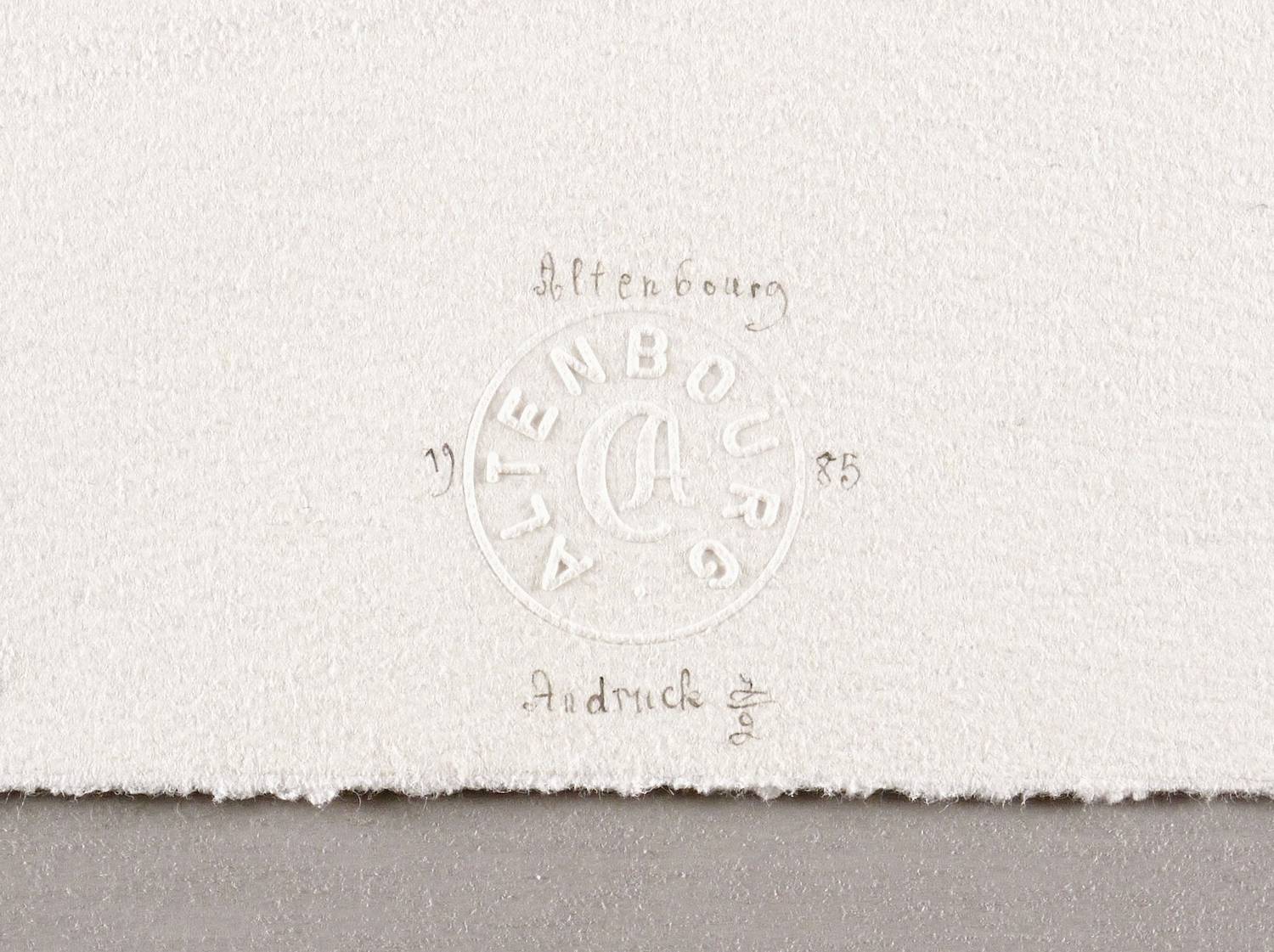 Janda R 56 1. – Im Blattrand unten in Bleistift signiert und datiert: ″Altenbourg 1985″. Dazu Blindstempel des Künstlers und Auflagenbezeichnung: ″Andruck 2/2″. Links daneben Titel: ″Keimnaher Versuch flügelflatternder Verschattung″. Wasserzeichen der Hahnemühle. – Druck von Thomas Ranft und Matthias Mann. - Exemplare der Auflage im Lindenau-Museum Altenburg, Kupferstichkabinett Berlin, in der Kunsthalle Hamburg und der Staatsgalerie Stuttgart. - Selten. – Breiter unbeschnittener Rand. Tadellos. Sehr guter Zustand.