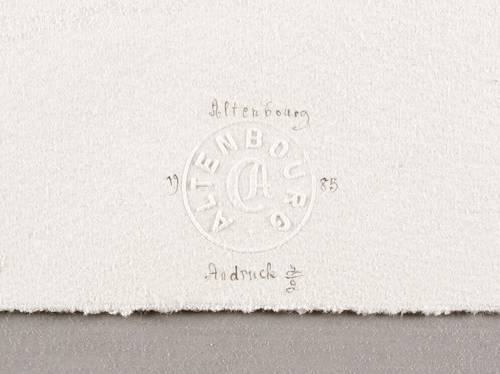 Gerhard Altenbourg (1926 Rödichen-Schnepfetal - 1989 Meißen). Deutscher Maler und Grafiker. 1929 Umzug nach Altenburg. 1944-45 Soldat im Zweiten Weltkrieg. 1946-48 als Schriftsteller und Journalist tätig, Zeichenunterricht bei Erich Dietz. 1948-50 Studium an der Hochschule für Baukunst und Bildende Kunst in Weimar bei Hans Hoffmann-Lederer. 1959 Teilnahme an der documenta II in Kassel. 1961 Gastatelier an der Kunstakademie in Westberlin. 1961 Erwerb einiger Arbeiten durch das Museum of Modern Art in New York. 1962-89 Atelier in Altenburg, Annahme des Künstlernamens "Altenbourg". 1966 Burda-Preis für Grafik in München. 1968 Will-Grohmann-Preis in Westberlin. 1970 Mitglied der Akademie der Künste, Berlin. 1977 Teilnahme an der documenta 6 und Mitgliedschaft bei der „Life Fellow of the International Biographical Association“ in Cambridge. In den 1980er Jahren Ausstellungsverbot und Schließung der Ausstellungen, da er sich den offiziellen Kunstauffassungen der DDR widersetzte. Seit 1998 vergibt das Lindenau-Museum in Altenburg aller zwei Jahre den Gerhard-Altenbourg-Preis.