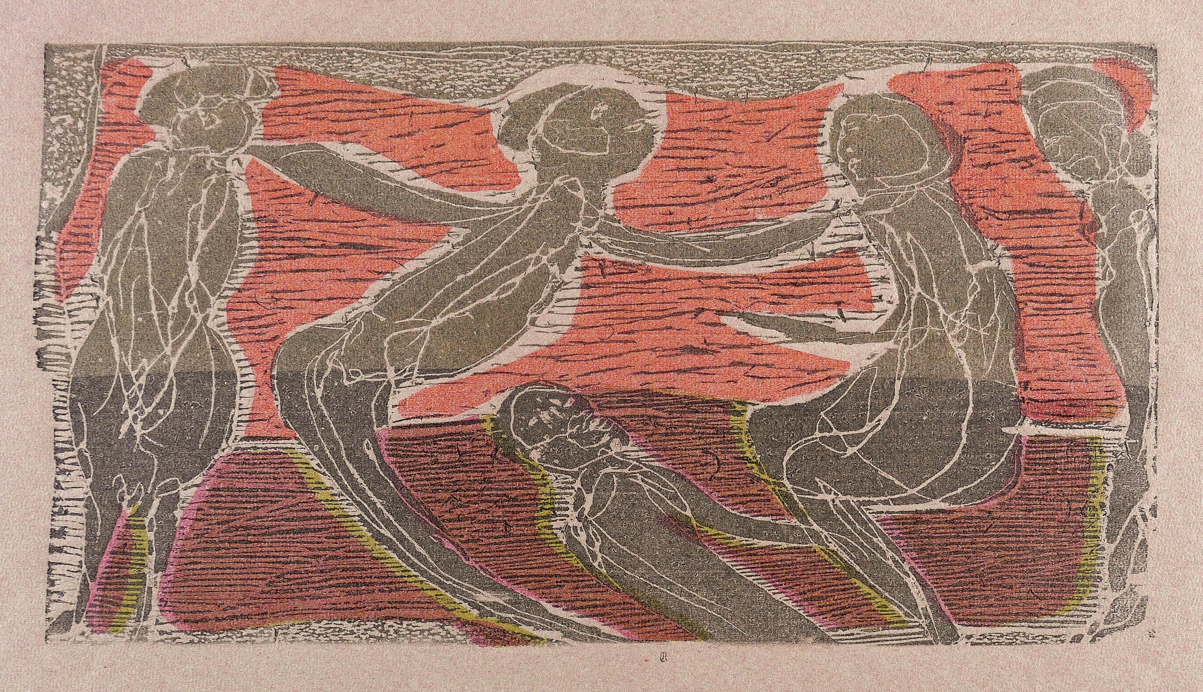 1978. Farbholzschnitt, in Grauoliv, Grün, Karminrot & Orange, auf braun getöntem Ingres. – Originale Künstlergrafik, von Gerhard Altenbourg. – Auflage Exemplar Nr. 45/47. – 20,5 x 38,3 cm (Darstellung / Druckstock), 36 x 47 cm (Blatt).