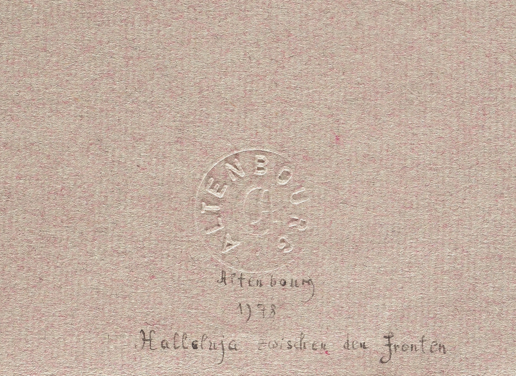 Janda H 203 IV 9. – Unterhalb in grauer Tusche signiert und datiert: ″Altenbourg 1978″. Dazu Titel: ″Halleluja zwischen den Fronten″. Darüber Prägestempel des Künstlers. Am rechten Blattrand Auflagenbezeichnung: ″45/47″. – Im Blattrand leichte Griffspuren. Rückseitig in den oberen Blattecken Spuren einer ehemaligen Montierung. Guter Zustand.