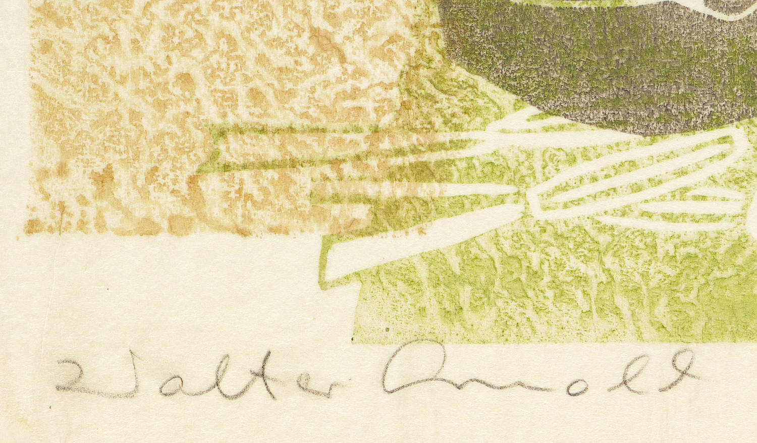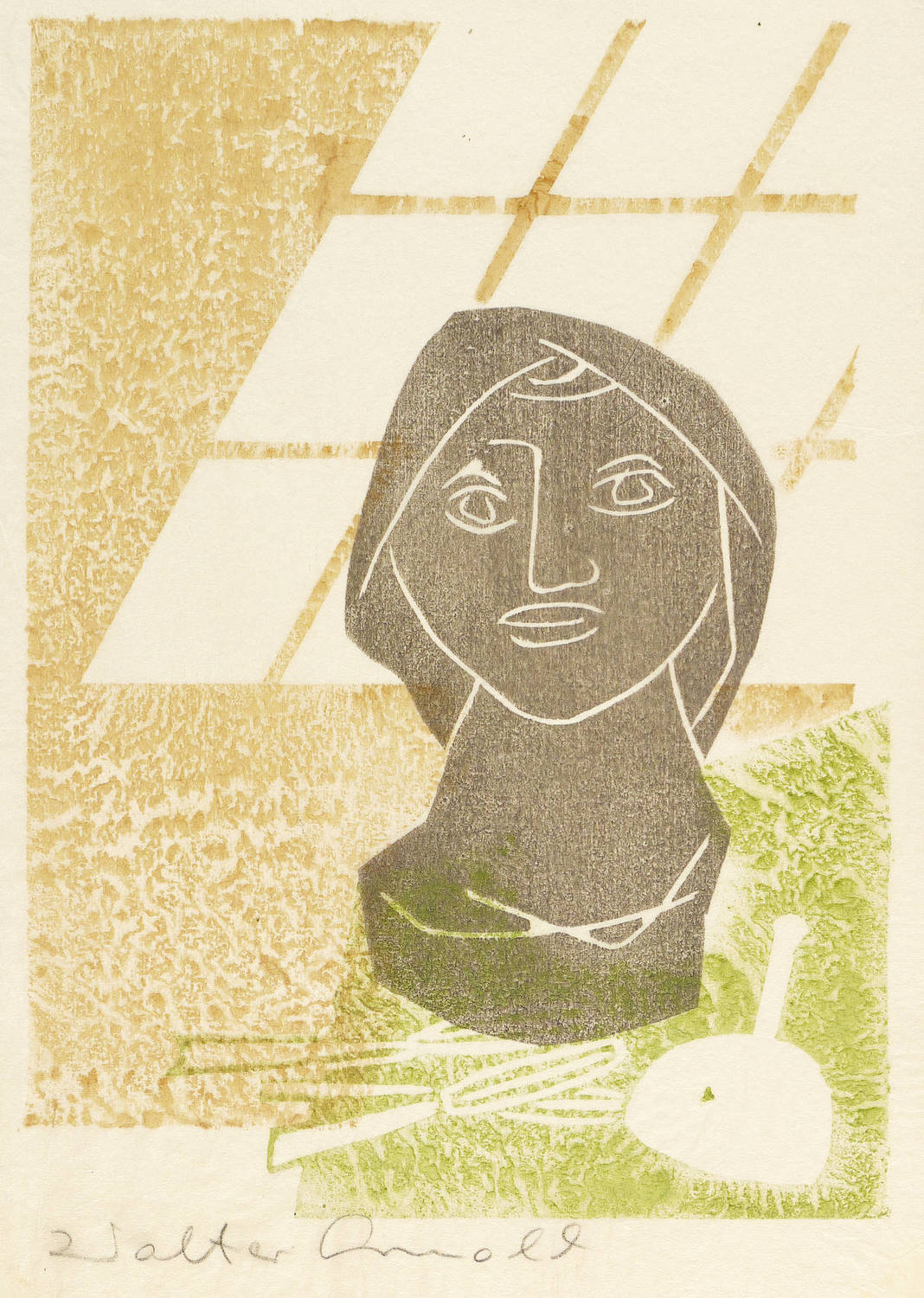 1972. Farbholzschnitt, Aquarellfarben in Grau, Ocker & Grün, auf Japanpapier. – Originale Künstlergrafik, von Walter Arnold. – 26,0 x 18,6 cm (Darstellung / Druckbild), 30 x 21 cm (Blatt), 31,5 x 22 cm (Trägerkarton).