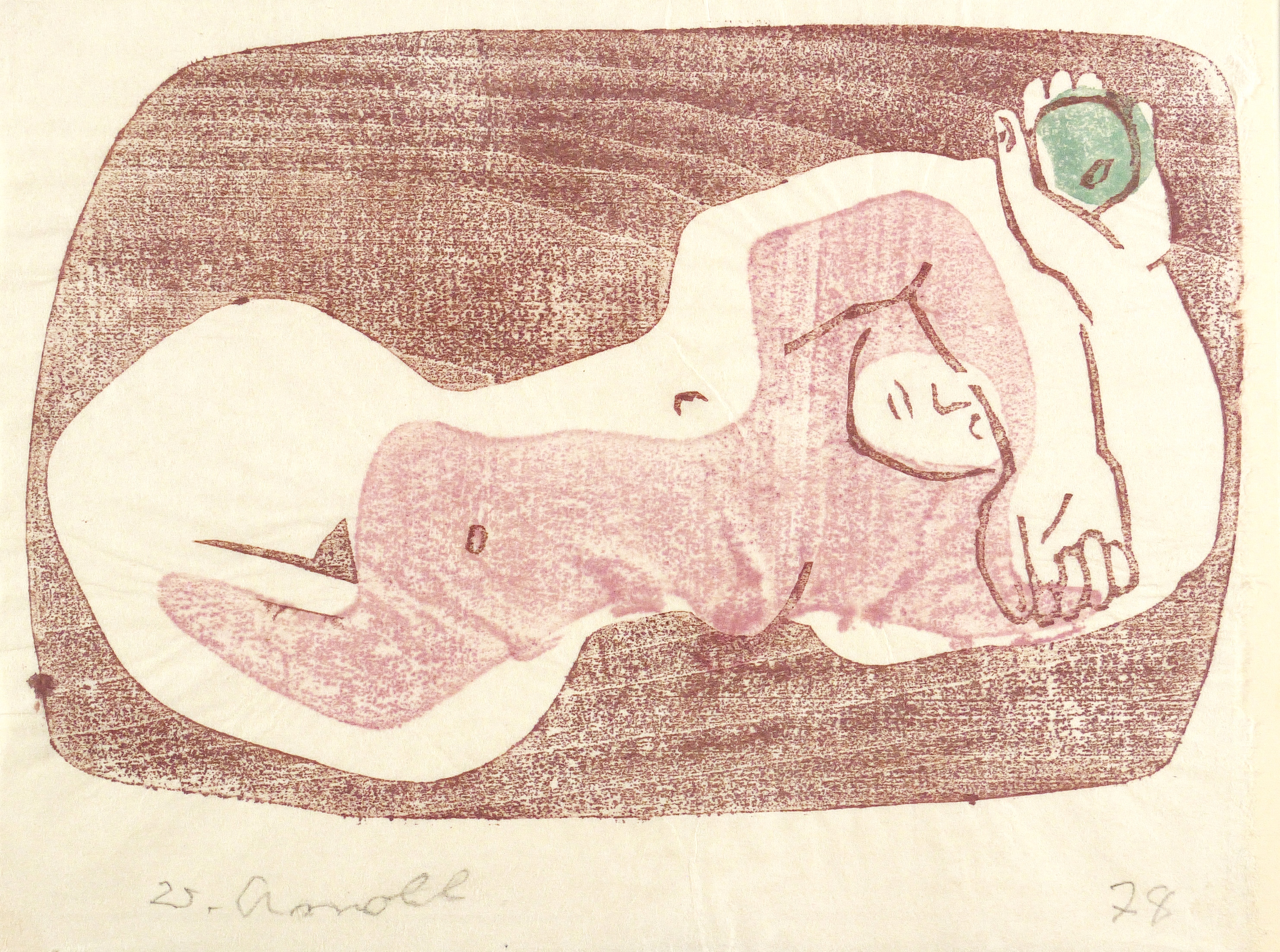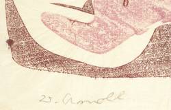 1978. Farbholzschnitt, Aquarellfarbe in Braun, Violett & Grün, auf Japanpapier. – Originale Künstlergrafik, von Walter Arnold. – 17,5 x 26,0 cm (Darstellung / Druckstock), 22 x 27 cm (Blatt), 23 x 28 cm (Trägerkarton).