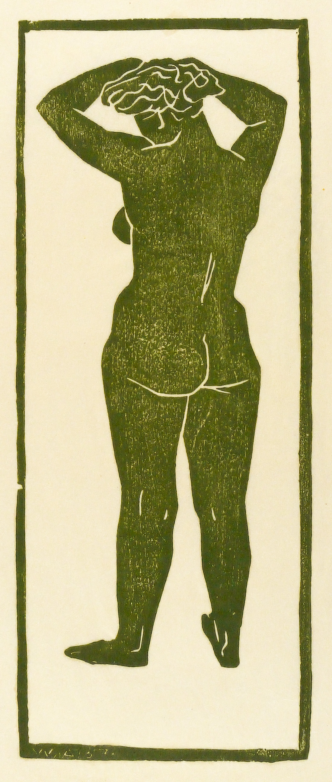 Nicht bei Heiland-Kukla. – Im Druckstock in der Umrahmung links unten Signatur und Jahr: ″W.A. 37″. – 1966 mit reduzierter Umrahmung als ″Rückenakt″ (WVZ Heiland/Kukla Nr. 62) nochmals gedruckt. – Sehr gut erhaltenes Exemplar.