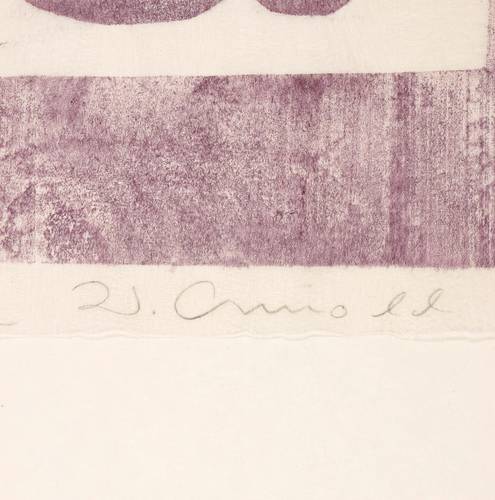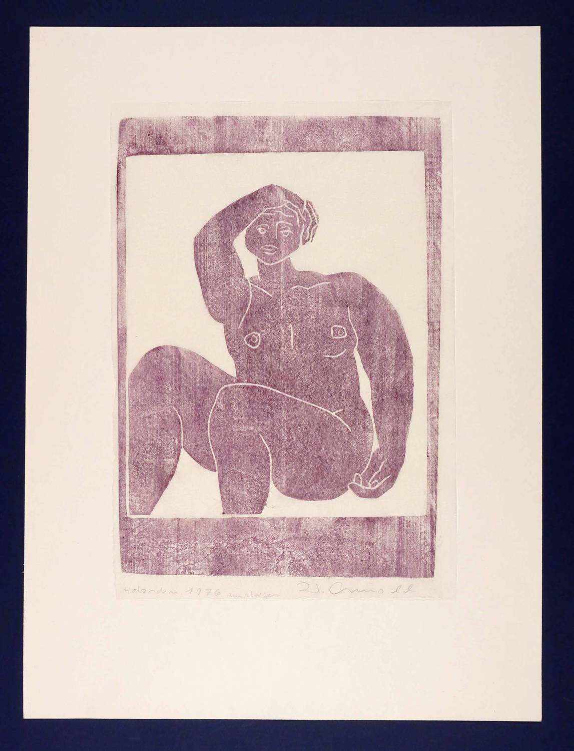 1976. Farbholzschnitt, Aquarellfarbe in Aubergine, auf Japanpapier. – Originale Künstlergrafik, von Walter Arnold. – 44,5 x 30,5 cm (Darstellung / Druckstock), 48 x 33 cm (Blatt), 67 x 50 cm (Trägerblatt).