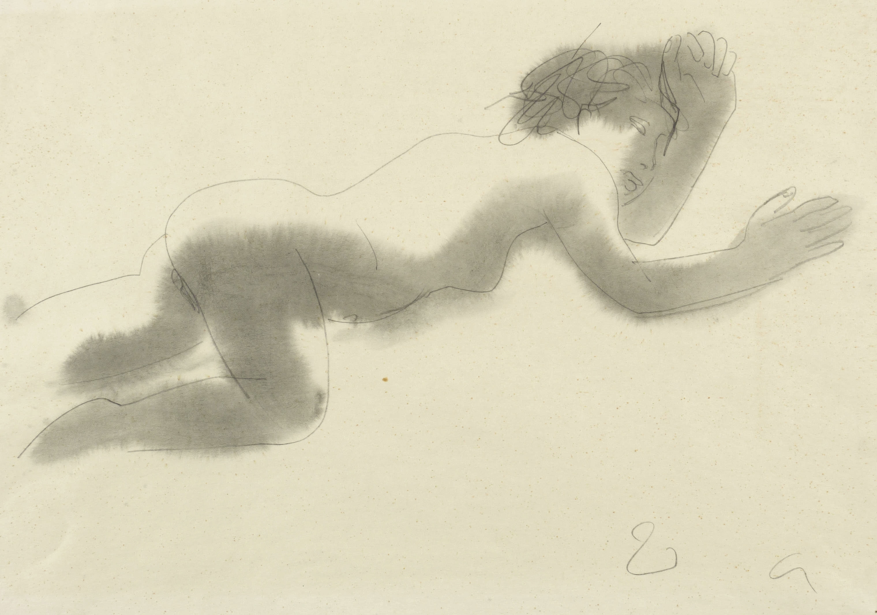 1968-1972. Zeichnung / Bleistiftzeichnung, mit Tusche in Grau laviert, auf gelblichem Velinkarton. – Originale Künstlergrafik, von Walter Arnold. – Unikat. – 19,5 x 38,0 cm (Darstellung), 30 x 42 cm (Blatt).