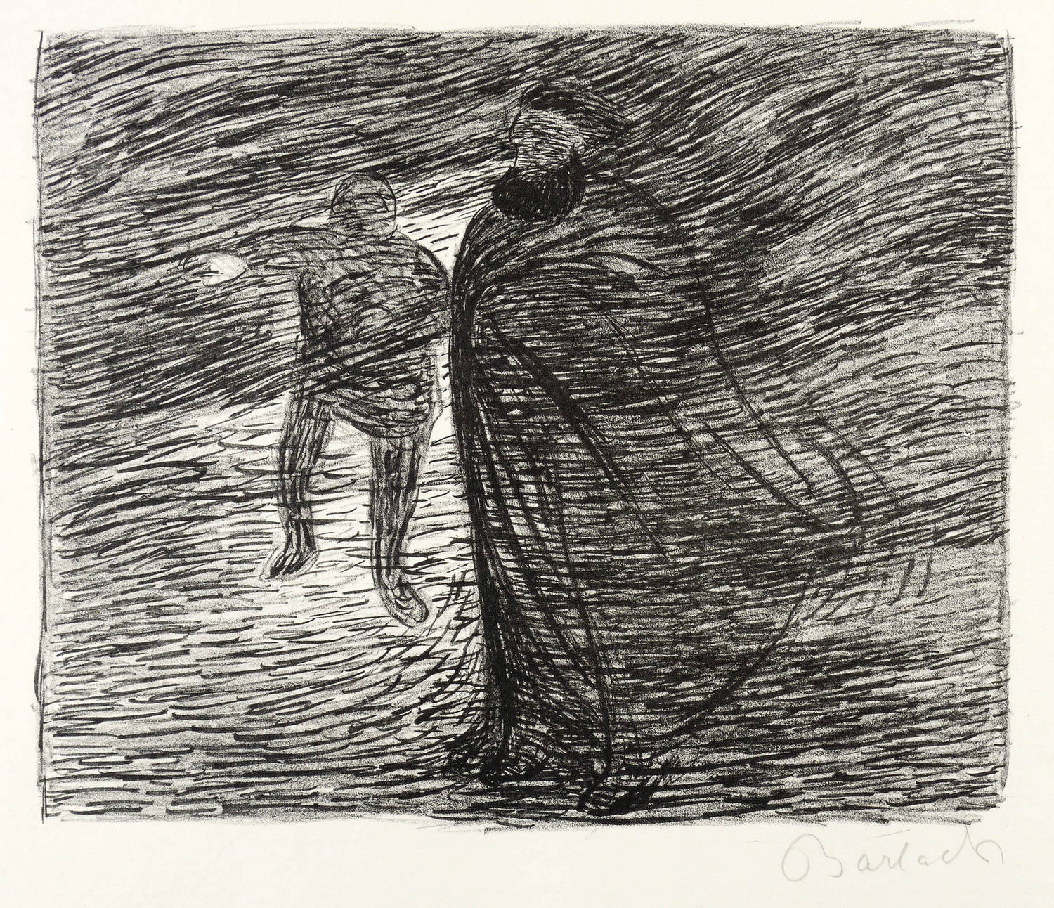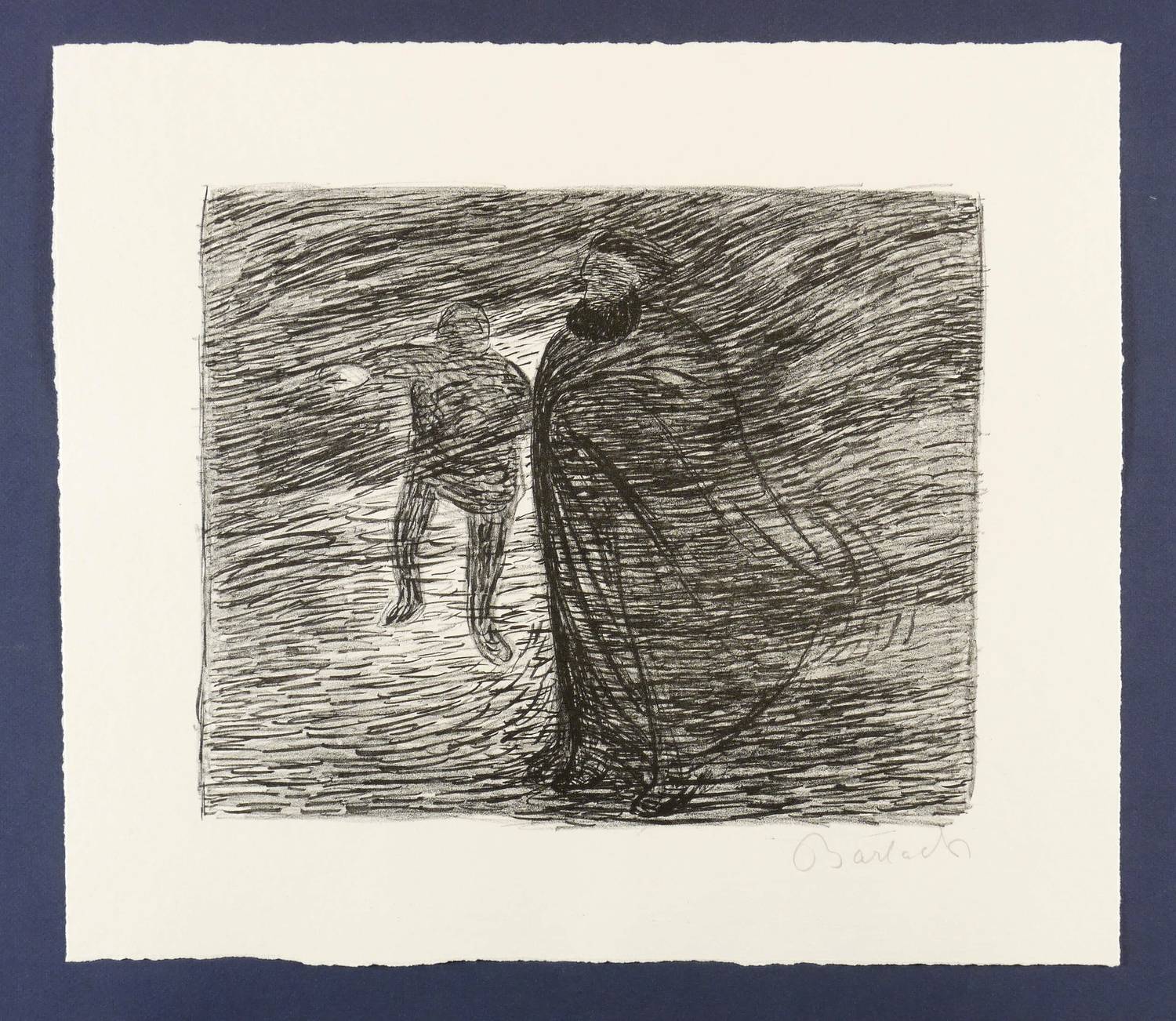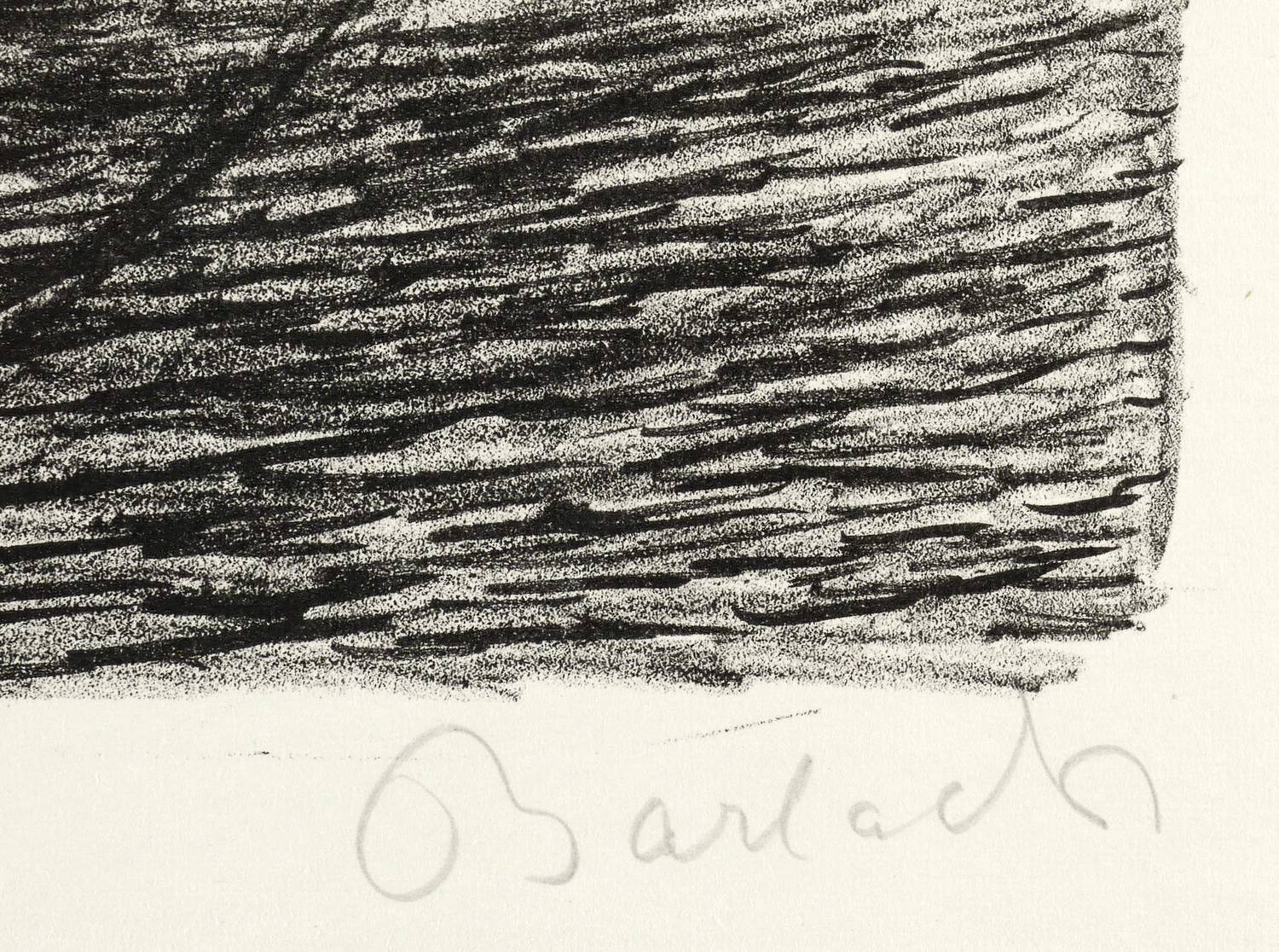 Laur 9.28. Schult 43. – Aus: Ernst Barlach, Der tote Tag. X. Werk der Pan-Presse (Berlin: Paul Cassirer 1912). – Rechts unten in Bleistift signiert: ″Barlach″. – Probedruck zum Blatt Nr. 24 aus dem Zyklus zu ″Der tote Tag″ von Ernst Barlach, gedruckt in der Pan-Presse und verlegt bei Paul Cassirer (Berlin 1912). – Originalrandiges Blatt mit gerissenen Kanten. Ohne Mangel. Hervorragender Zustand.
