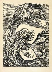 1919. Holzschnitt, in Schwarz, auf gelbem Maschinenpapier. – Originale Künstlergrafik, von Ernst Barlach. – 17,1 x 12,2 cm (Darstellung / Druckstock), 24 x 17 cm (Blatt).