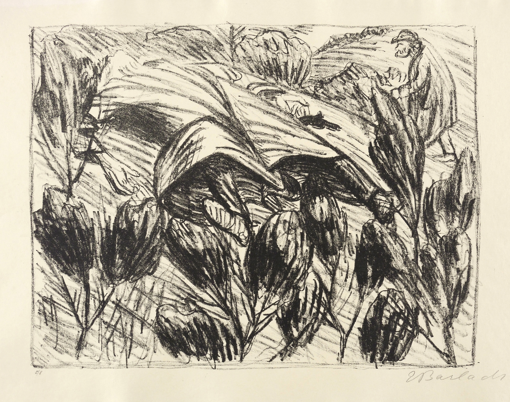 Laur 54.11 A 1. Schult 123. – Aus: Ernst Barlach, Der arme Vetter (Berlin: Paul Cassirer 1919). – Rechts unten in Bleistift signiert: ″E Barlach″. Links Auflagenbezeichnung: ″5/8″. – Blatt Nr. 7 aus dem Lithografie-Zyklus ″Der arme Vetter″ von 1919. – Handsignierter und nummerierter Druck der ersten durchnummerierten Ausgabe von 80 Exemplaren. – Dargestellte Szene: Iver liegt zwischen den Sträuchern, nachdem er vergeblich versuchte, sich zu erschießen. – Originalrandiges Exemplar. Die Blattkanten minimal gewellt. Sehr guter Zustand.