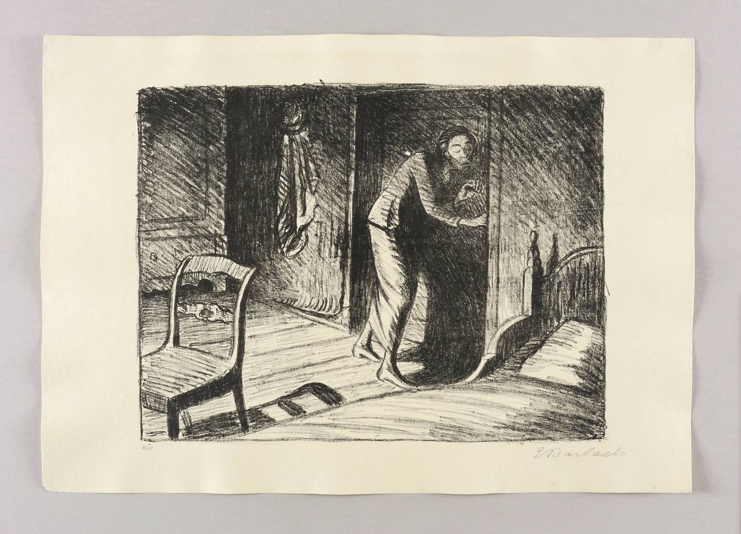 Laur 54.21 A 1. Schult 132. – Aus: Ernst Barlach, Der arme Vetter (Berlin: Paul Cassirer 1919). – Rechts unten in Bleistift signiert: ″E Barlach″. Links Auflagenbezeichnung: ″5/15″. – Blatt Nr. 16 aus dem Lithografie-Zyklus ″Der arme Vetter″ von 1919. – Handsignierter und nummerierter Druck der ersten durchnummerierten Ausgabe von 80 Exemplaren. – Dargestellte Szene: Fräulein Lena Isenbarn lauscht an der Tür (Wirtshaus). – Originalrandiges Exemplar. Schöner kräftiger Druck. Die linke untere Blattecke leicht bestoßen. Sehr guter Zustand.