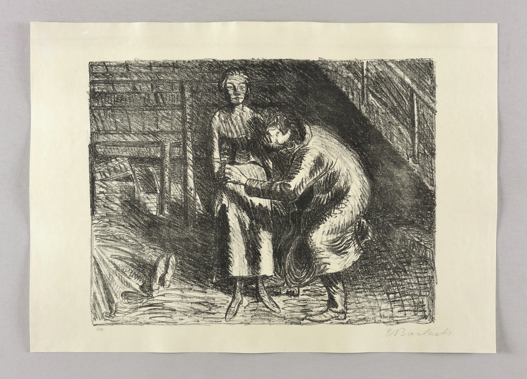Laur 54.41 A 1. Schult 152. – Aus: Ernst Barlach, Der arme Vetter (Berlin: Paul Cassirer 1919). – Rechts unten in Bleistift signiert: ″E Barlach″. Links Auflagenbezeichnung: ″5/33″. – Blatt Nr. 34 aus dem Lithografie-Zyklus ″Der arme Vetter″ von 1919. – Handsignierter und nummerierter Druck der ersten durchnummerierten Ausgabe von 80 Exemplaren. – Dargestellte Szene: Fräulein Isenbarn steht vor der Leiche Ivers, während Siebenmark sie gebückt zu umarmen sucht. – Blattkanten oben und unten kaum merklich gewellt. Sehr guter Zustand.