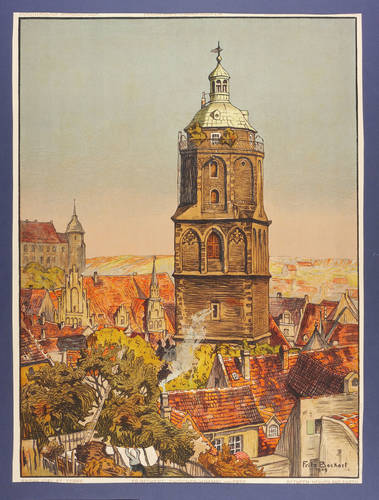 Im Stein rechts unten signiert und datiert: ″Fritz Beckert / 1909.″ – Originalgrafischer Druck der Kunstanstalt Wilhelm Hoffmann in Dresden für den Teubner Verlag in Leipzig. – Oben und unten Schrift etwas beschnitten. Sonst guter Zustand.