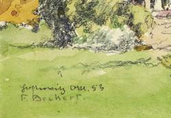 Links unten in schwarzer Kreide signiert: ″F. Beckert″. Darüber bezeichnet: ″Hosterwitz Okt. 53″. – Ansicht der Schifferkirche Maria am Wasser in Hosterwitz von den Elbwiesen bei Pillnitz aus gesehen. – Ohne Tadel. Hervorragender Zustand.