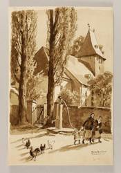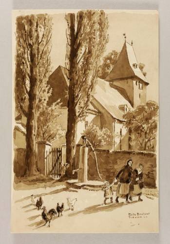 Um 1950. Zeichnung / Pinselzeichnung, in brauner Tusche, auf hartem gelbem Velin. – Originale Künstlergrafik, von Fritz Beckert. – Unikat. – 35,0 x 23,0 cm (Darstellung / Blatt).