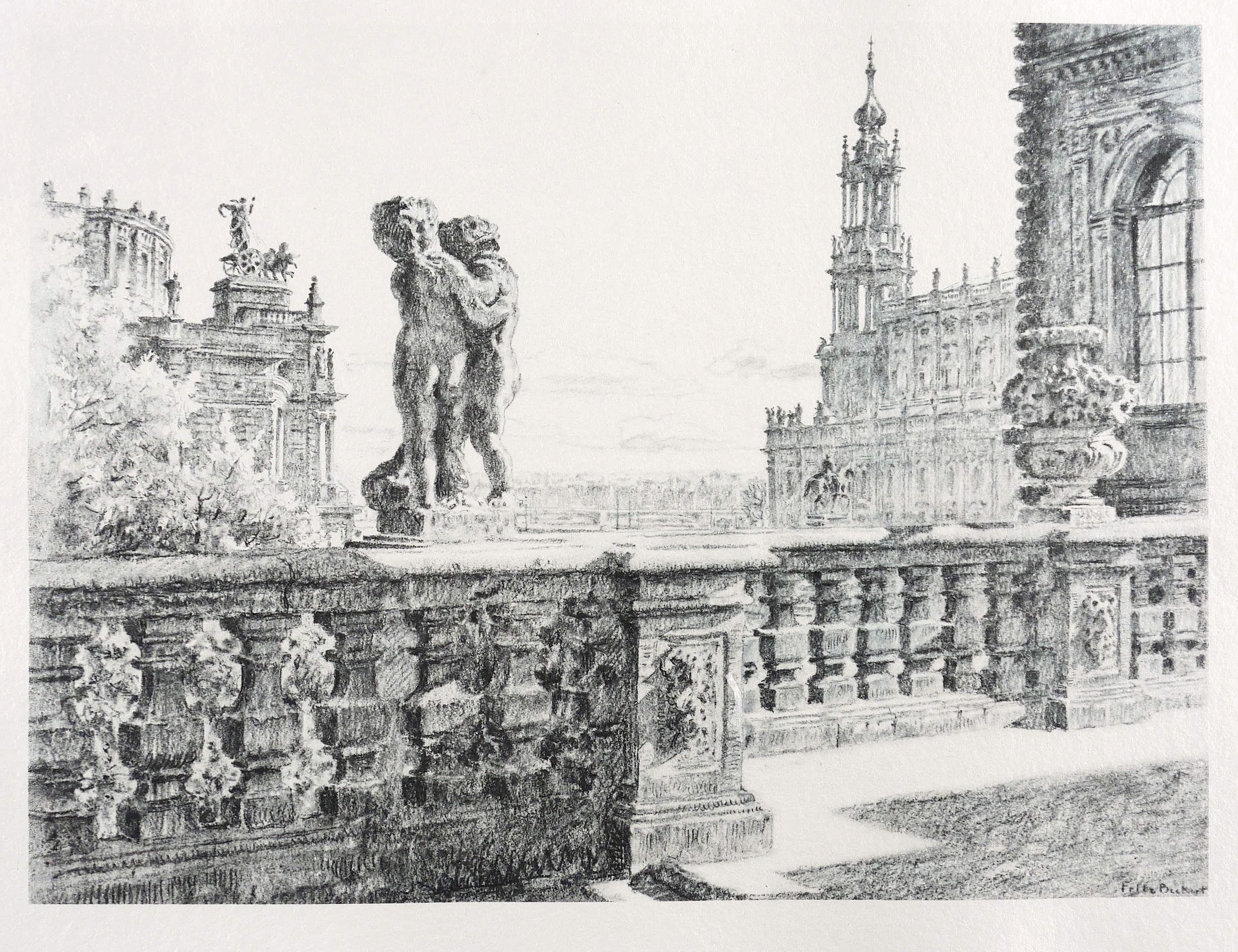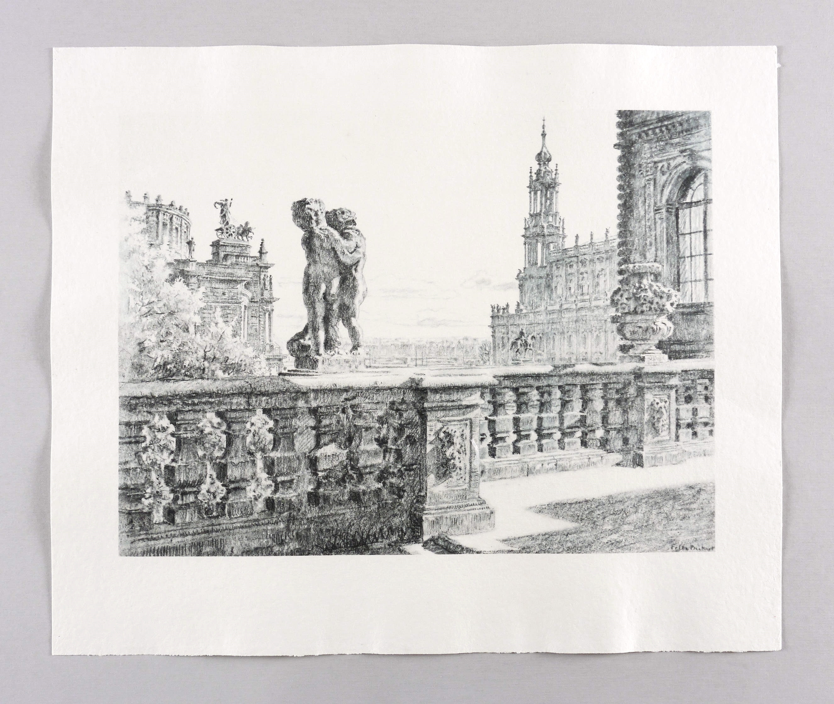 Aus: Fritz Beckert, Die Türme von Dresden. 12 Kunstblätter nach Zeichnungen, Aquarellen und einem Gemälde (Dresden-Niedersedlitz: Selbstverlag [1949]). – Nicht handsigniert. In der Darstellung rechts unten gedruckte Signatur. – Papier etwas gegilbt. Im Rand gering fleckig. Mäßig guter Zustand.