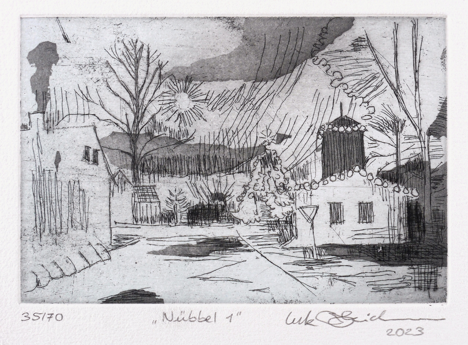 Rechts unten in Bleistift signiert und datiert: ″Lutz Bleidorn 2023″. Links Auflagenbezeichnung: ″32/70″. Mittig Titel: ″Nübbel 1″. – Sehr guter Zustand.