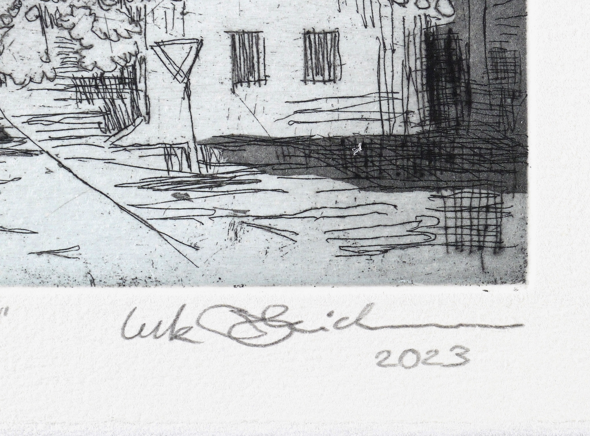 2023. Radierung / Strichätzung & Aquatinta, in Schwarzblau, auf hellchamois Bütten. – Originale Künstlergrafik, von Lutz Bleidorn. – Auflage Exemplar Nr. 35/70. – 9,8 x 14,4 cm (Darstellung / Platte), 14 x 20 cm (Blatt).