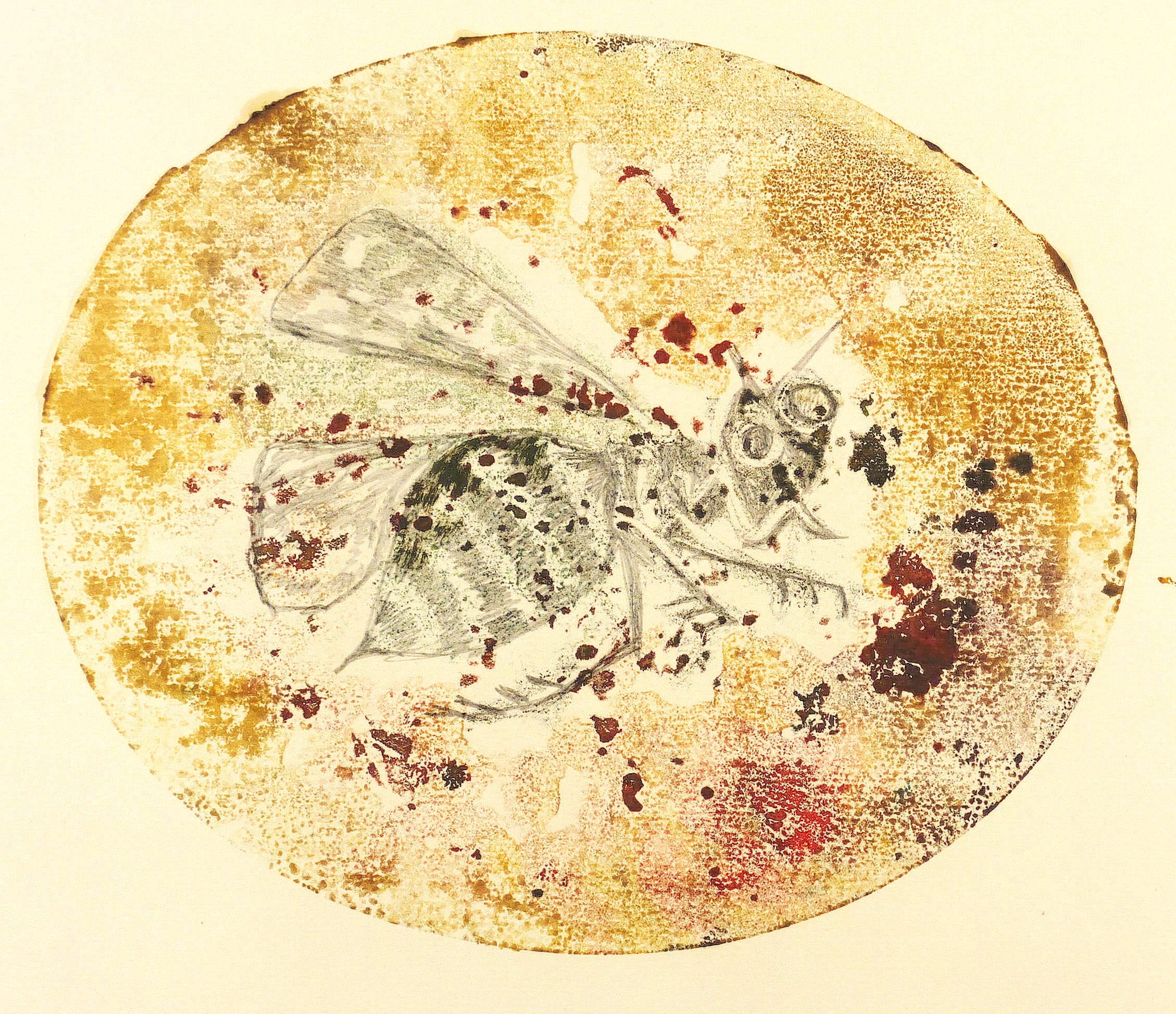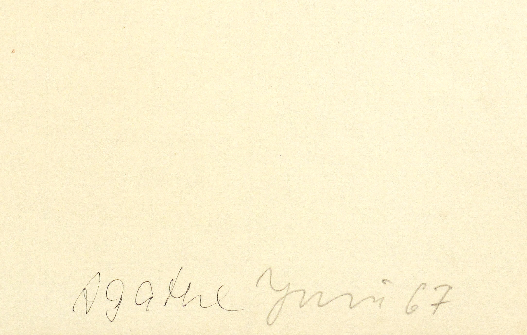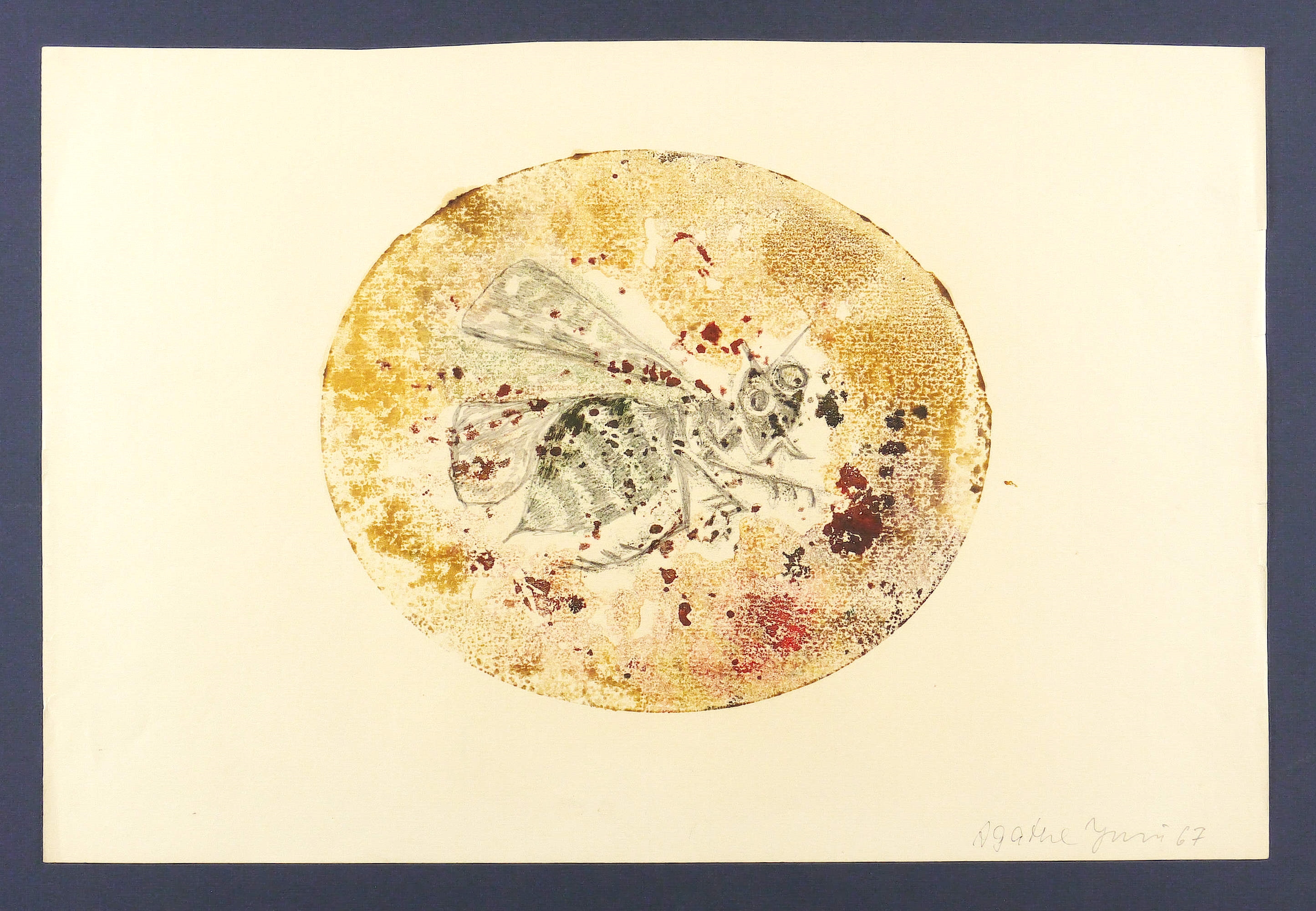 1967. Farbmonotypie, in Braun, Gelb & Rot, mit Bleistift überarbeitet, auf Bütten. – Originale Künstlergrafik, von Agathe Böttcher. – Unikat. – 22,4 x 26,8 cm (Darstellung / Oval), 33 x 49 cm (Blatt).
