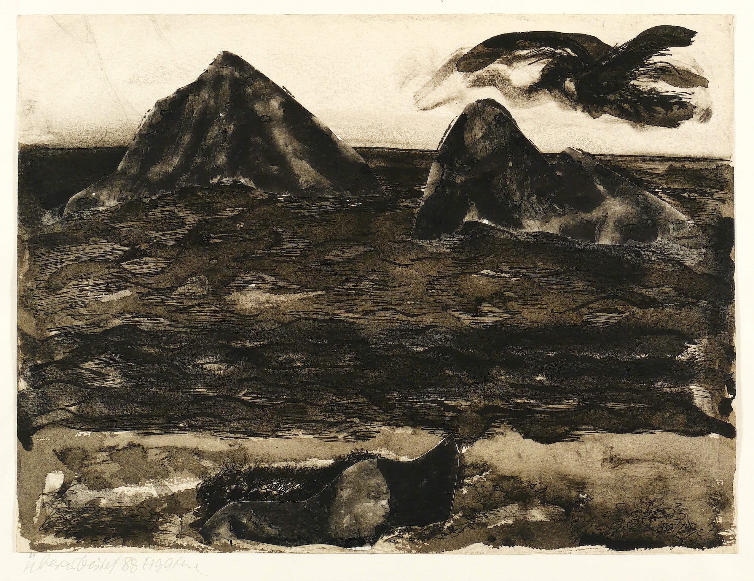 1970/1988. Zeichnung / Pinselzeichnung, in schwarzer Tusche, mit Collage. – Originale Künstlergrafik, von Agathe Böttcher. – Unikat. – 24,0 x 32,0 cm (Darstellung / Blatt), 30 x 42 cm (Trägerblatt).