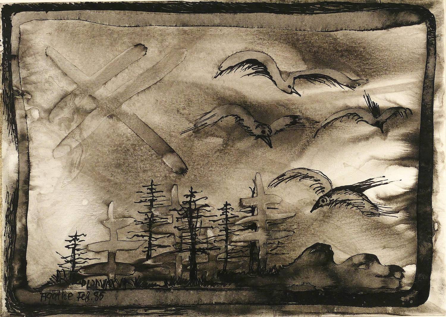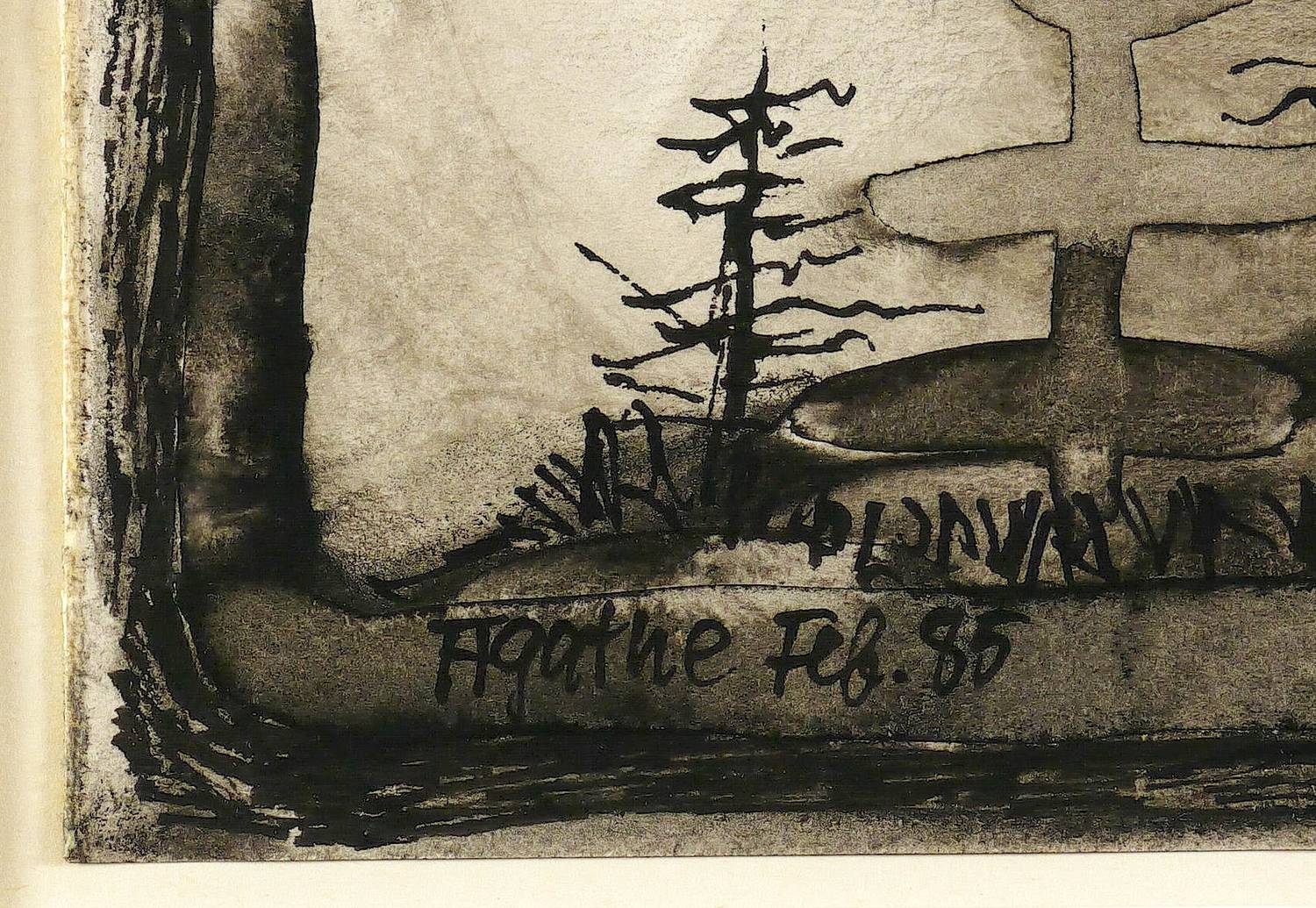 1985. Zeichnung / Pinsel- & Federzeichnung, in schwarzer Tusche, auf Papier. – Originale Künstlergrafik, von Agathe Böttcher. – Unikat. – 21,2 x 29,5 cm (Darstellung / Blatt), 30 x 42 cm (Trägerblatt), 40 x 50 cm (Passepartout).