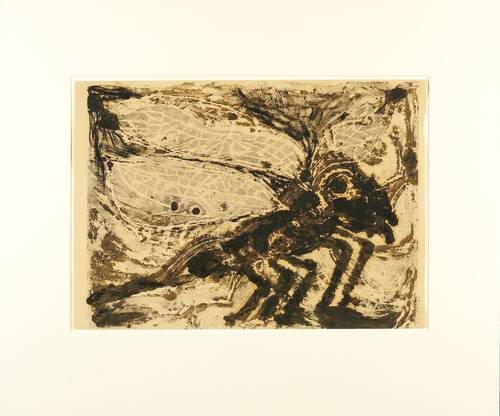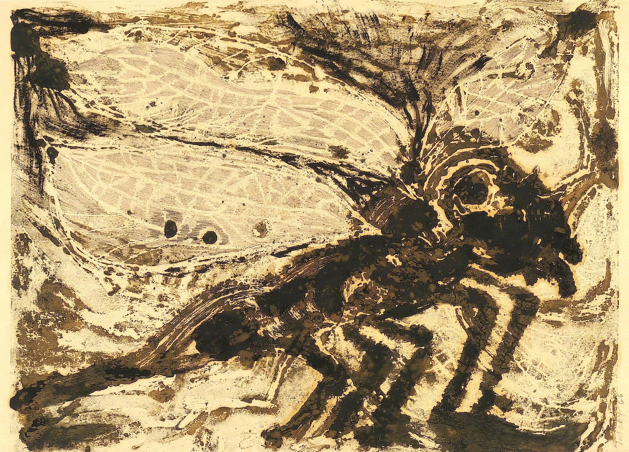 1966. Farbmonotypie, in Blaugrau, Braun & Schwarz, auf hellgelbem Velin. – Originale Künstlergrafik, von Agathe Böttcher. – Unikat. – 39,3 x 29,4 cm (Darstellung / Blatt), 42 x 30 cm (Blatt), 60 x 50 cm (Passepartout).