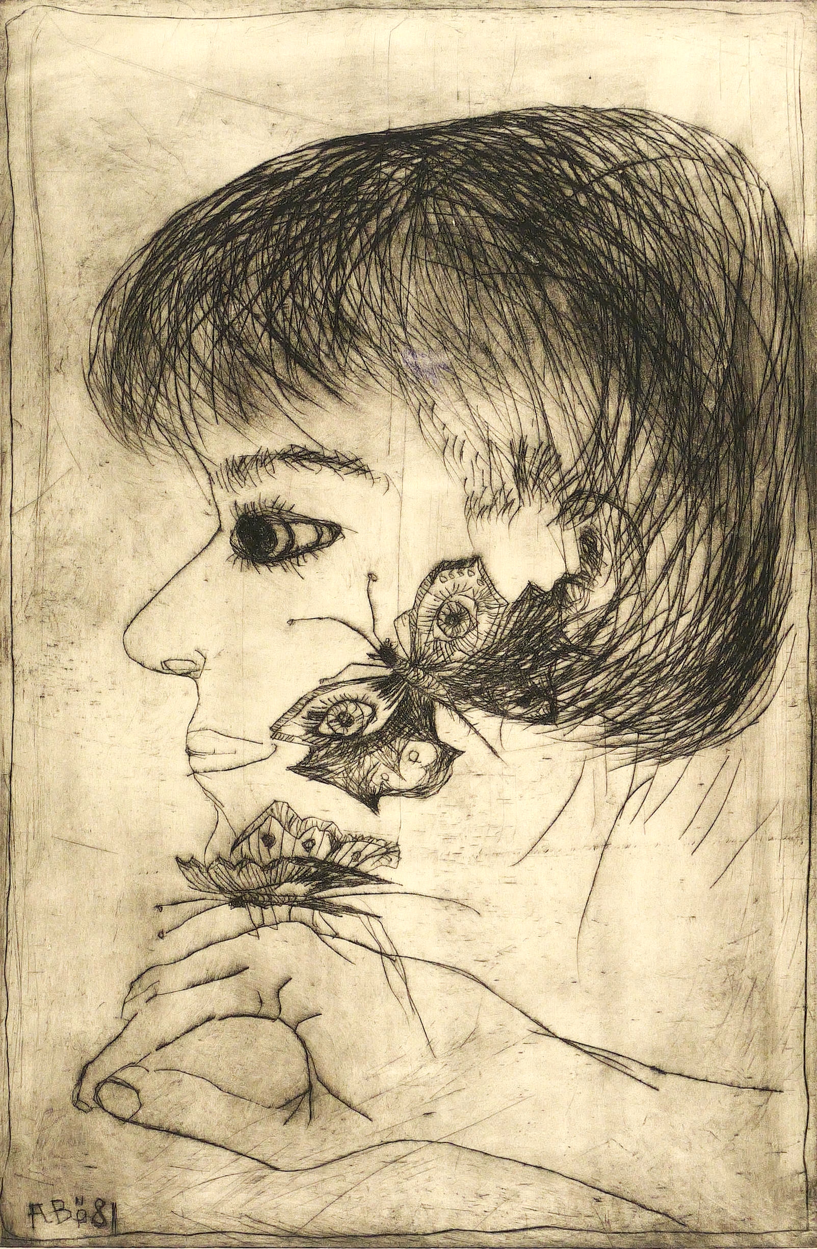 Böttcher, Agathe. – „Frauenkopf mit Schmetterlingen”.