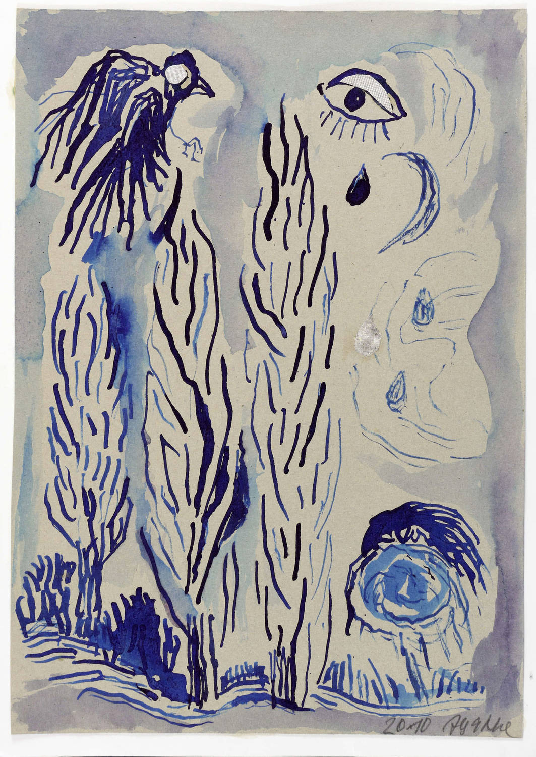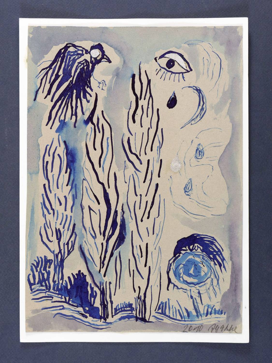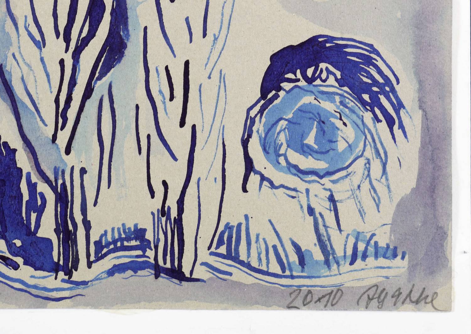 2010. Zeichnung / Pinselzeichnung, in blauer Tusche, auf hellgrauem Karton. – Originale Künstlergrafik, von Agathe Böttcher. – Unikat. – 28,0 x 19,7 cm (Darstellung / Blatt), 29,5 x 21,0 cm (Trägerkarton).
