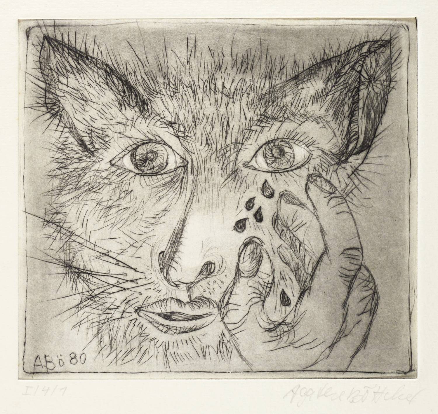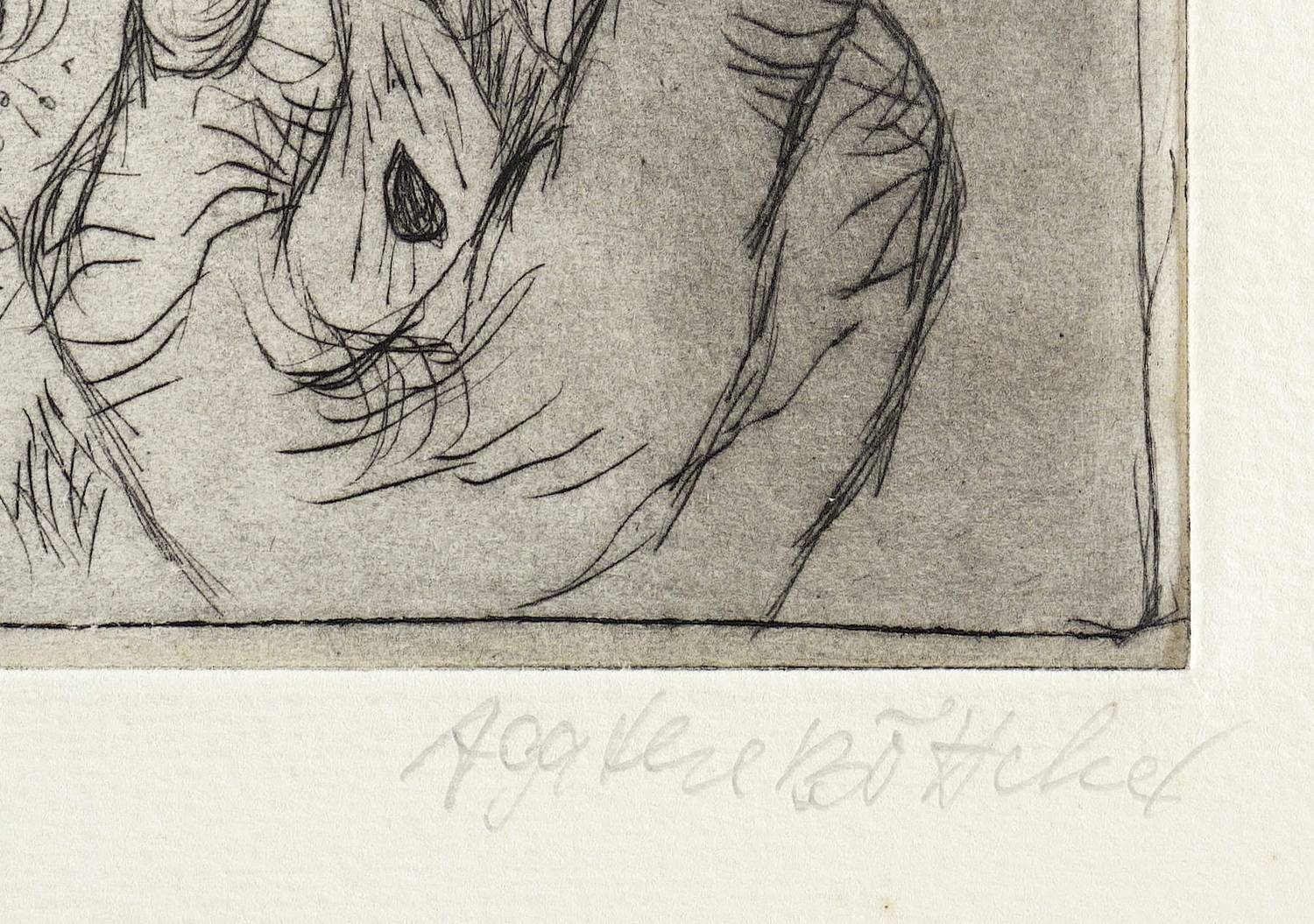 1980. Radierung / Kaltnadel, mit Plattenton, in Schwarz, auf Hahnemühle-Bütten. – Originale Künstlergrafik, von Agathe Böttcher. – Auflage Exemplar Nr. 1/4. – 16,3 x 17,9 cm (Darstellung / Platte), 38 x 26 cm (Blatt).