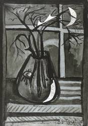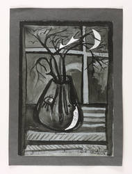 1989. Zeichnung / Pinselzeichnung, in schwarzer Tusche, mit Folienapplikation, auf Tonpapier. – Originale Künstlergrafik, von Agathe Böttcher. – Unikat. – 30,1 x 21,0 cm (Darstellung / Blatt), 35 x 26 cm (Trägerkarton).