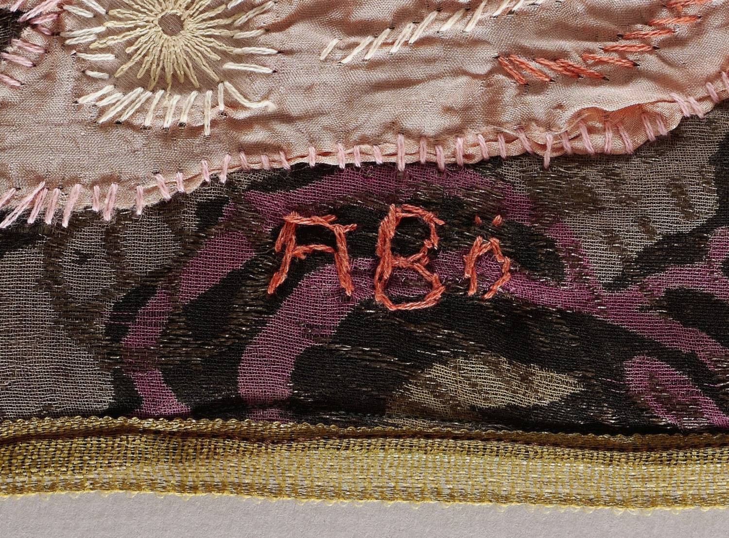 1975-1985. Textilcollage, diverse Stoffe, Pailleten & Zwirn, auf Brokat. – Von Agathe Böttcher. – Unikat. – 27,0 x 42,0 cm (Darstellung).