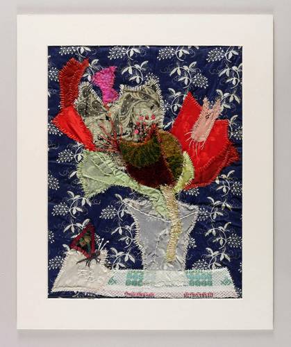 Um 1980. Textilcollage, diverse Stoffe, Pailletten, Samt & Zwirn, auf blau gemustertem Leinen. – Von Agathe Böttcher. – Unikat. – 41,5 x 32,0 cm (Darstellung).