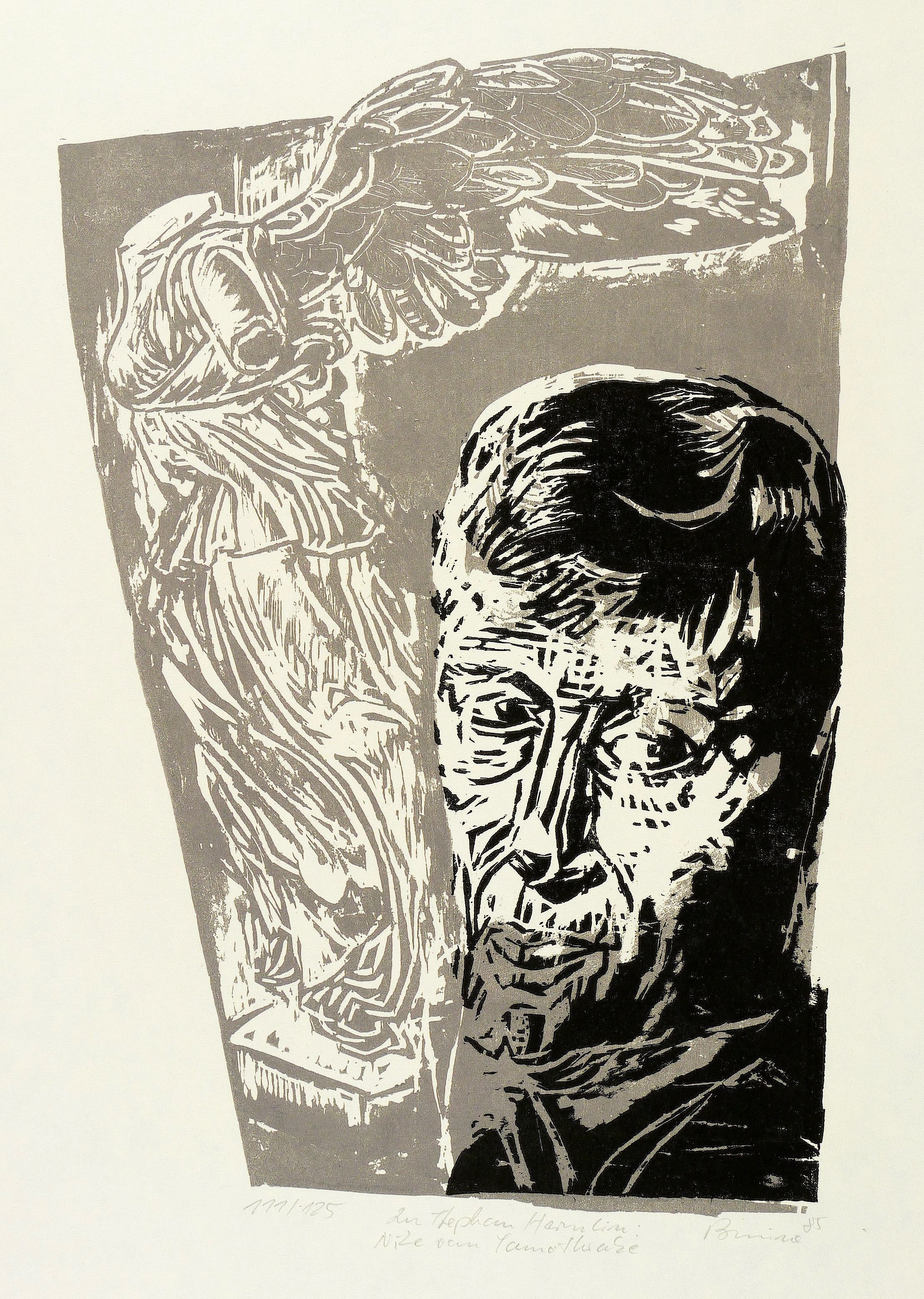 1985. Farbholzschnitt, in Hellgrau & Schwarz, auf hellchamois Velinkarton. – Originale Künstlergrafik, von Gudrun Brüne. – Auflage Exemplar Nr. 111/125. – 34,0 x 23,5 cm (Darstellung), 48 x 36 cm (Blatt).