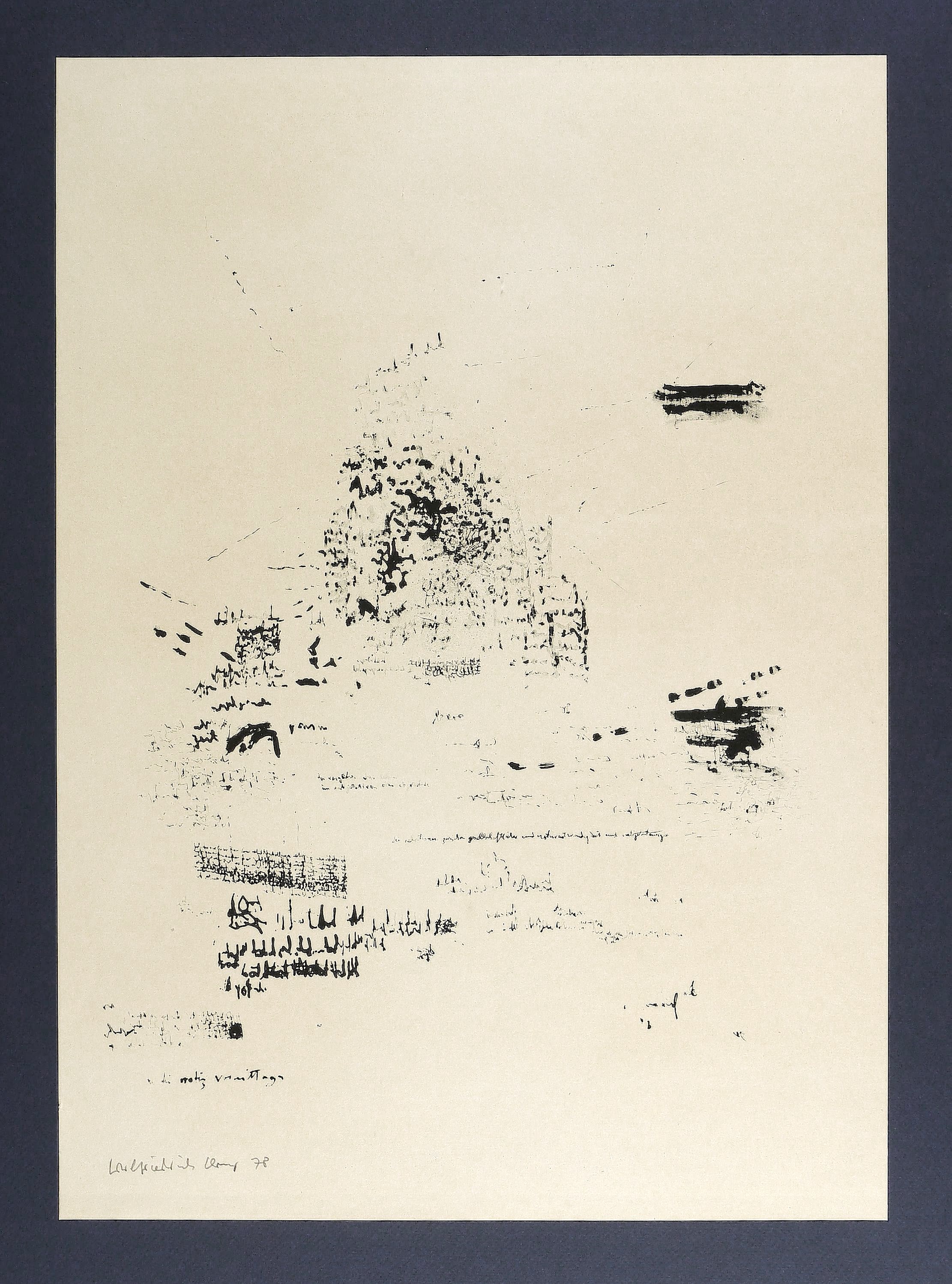 1978. Offsetlithografie / Feder-, Pinsel- & Kreidelithografie, in Schwarz, auf hellchamois Velin. – Originale Künstlergrafik, von Carlfriedrich Claus. – 37,0 x 30,3 cm (Darstellung / Stein), 49 x 35 cm (Blatt).