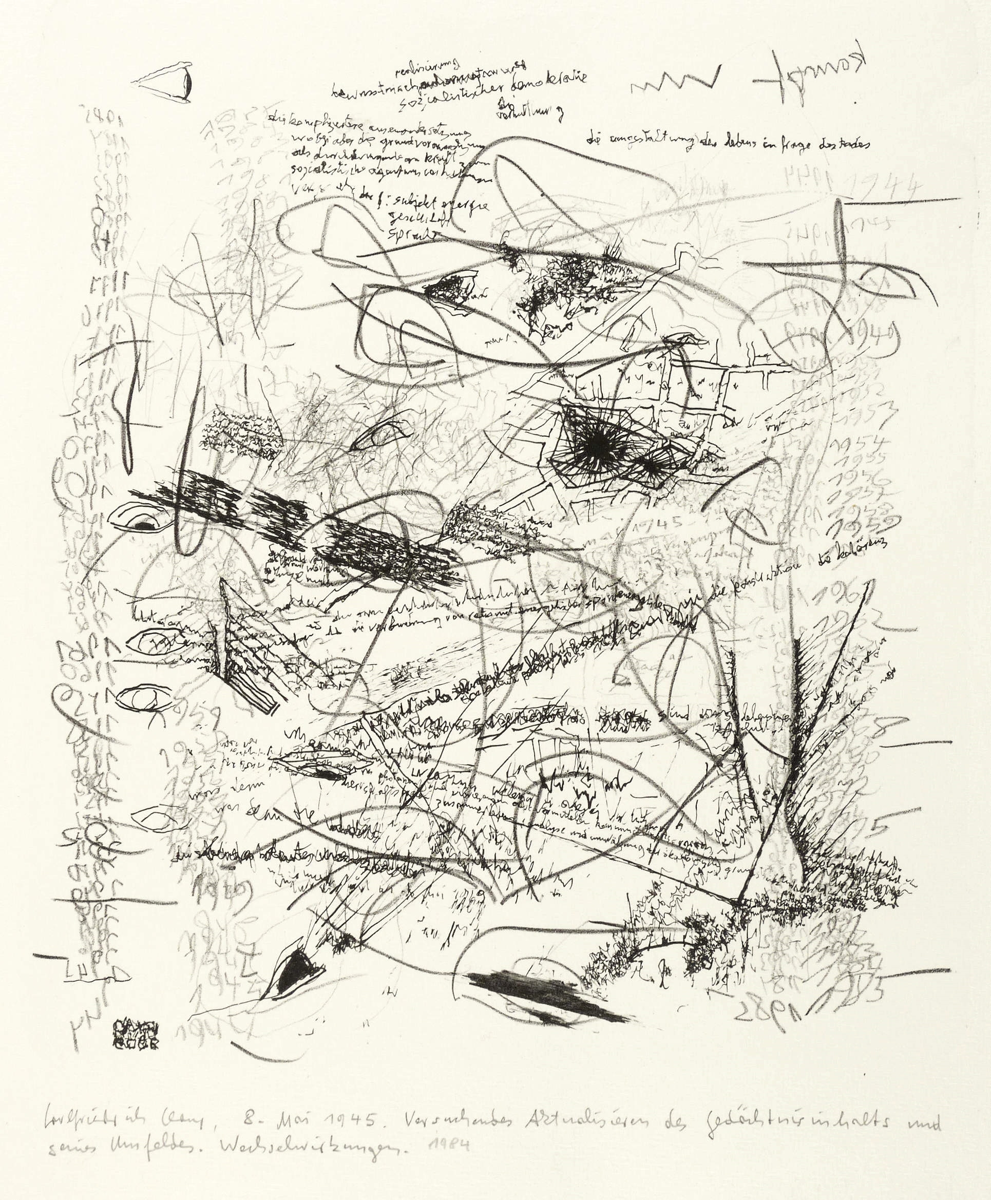 1984. Lithografie / Feder- & Kreidelithografie, in Schwarz, auf Büttenkarton. – Von Carlfriedrich Claus. – 28,7 x 26,4 cm (Darstellung / Druckbild), 40 x 35 cm (Blatt).