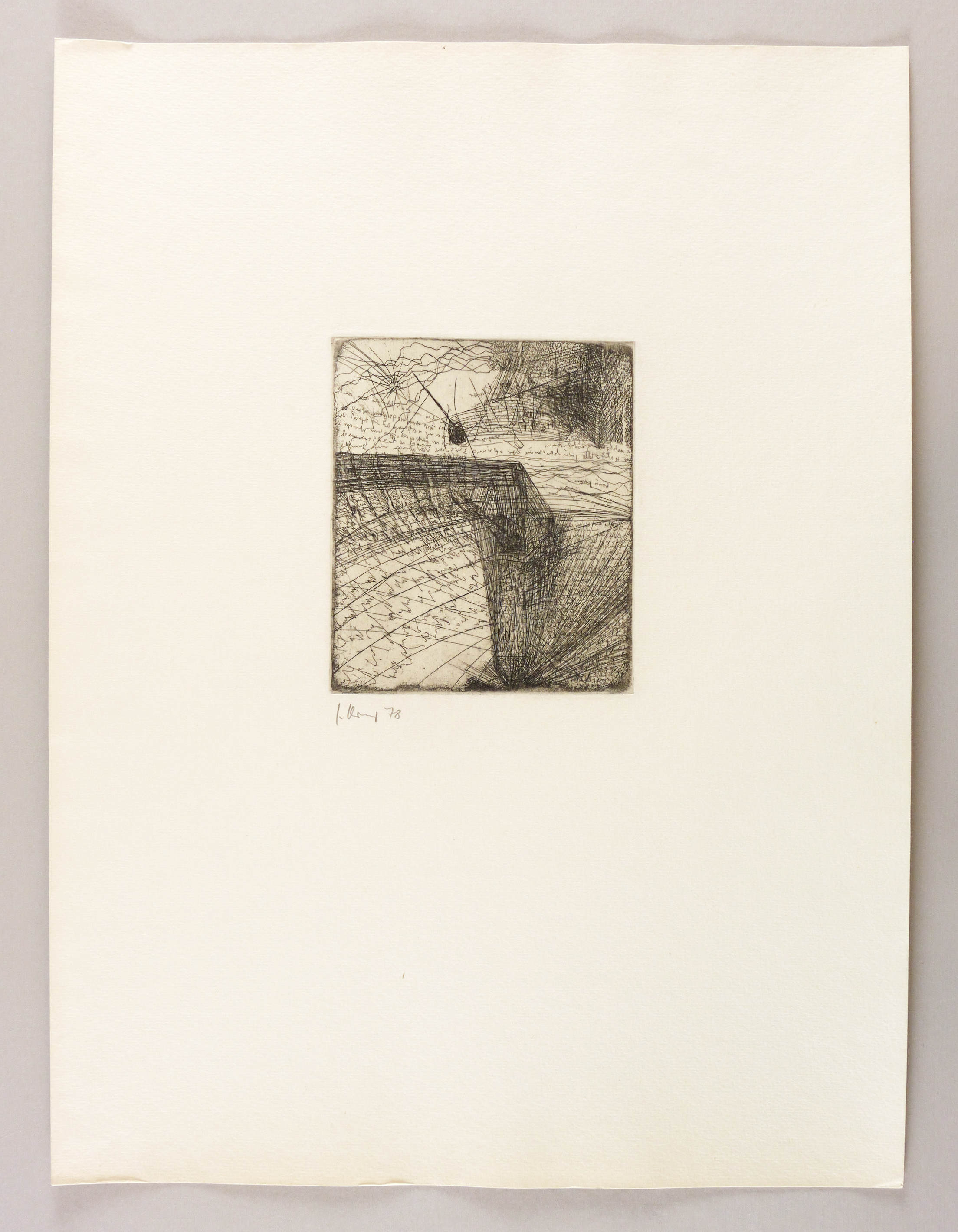 1978. Radierung / Strichätzung, in Schwarz, auf hellgelbem Kupferdruckpapier. – Originale Künstlergrafik, von Carlfriedrich Claus. – 15,1 x 12,7 cm (Darstellung / Platte), 48 x 36 cm (Blatt).