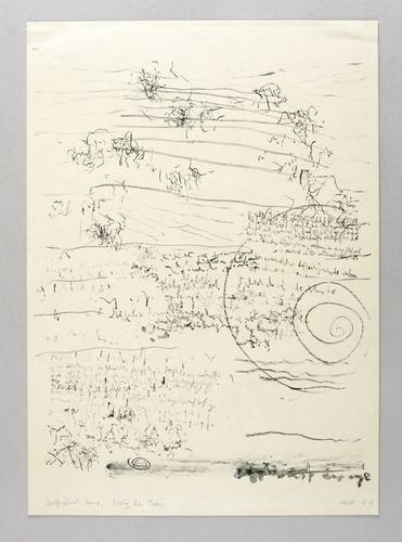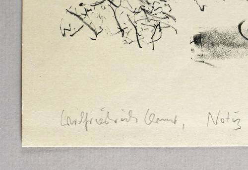 Werner-Juppe G 50 b. – Links unten in Bleistift signiert und betitelt: ″Carlfriedrich Claus, Notiz des Todes″. Rechts Jahr und Auflagenbezeichnung: ″1978 / EA″. – Drucker W. Arnoldi, Berlin-Müggelheim. - Neben einigen Probedrucken existieren insgesamt nur 10 Auflagendrucke, die entweder nummeriert oder als Künstlerexemplare ausgewiesen wurden. – Perfekt erhalten. Keine Mängel. Sehr guter Zustand.