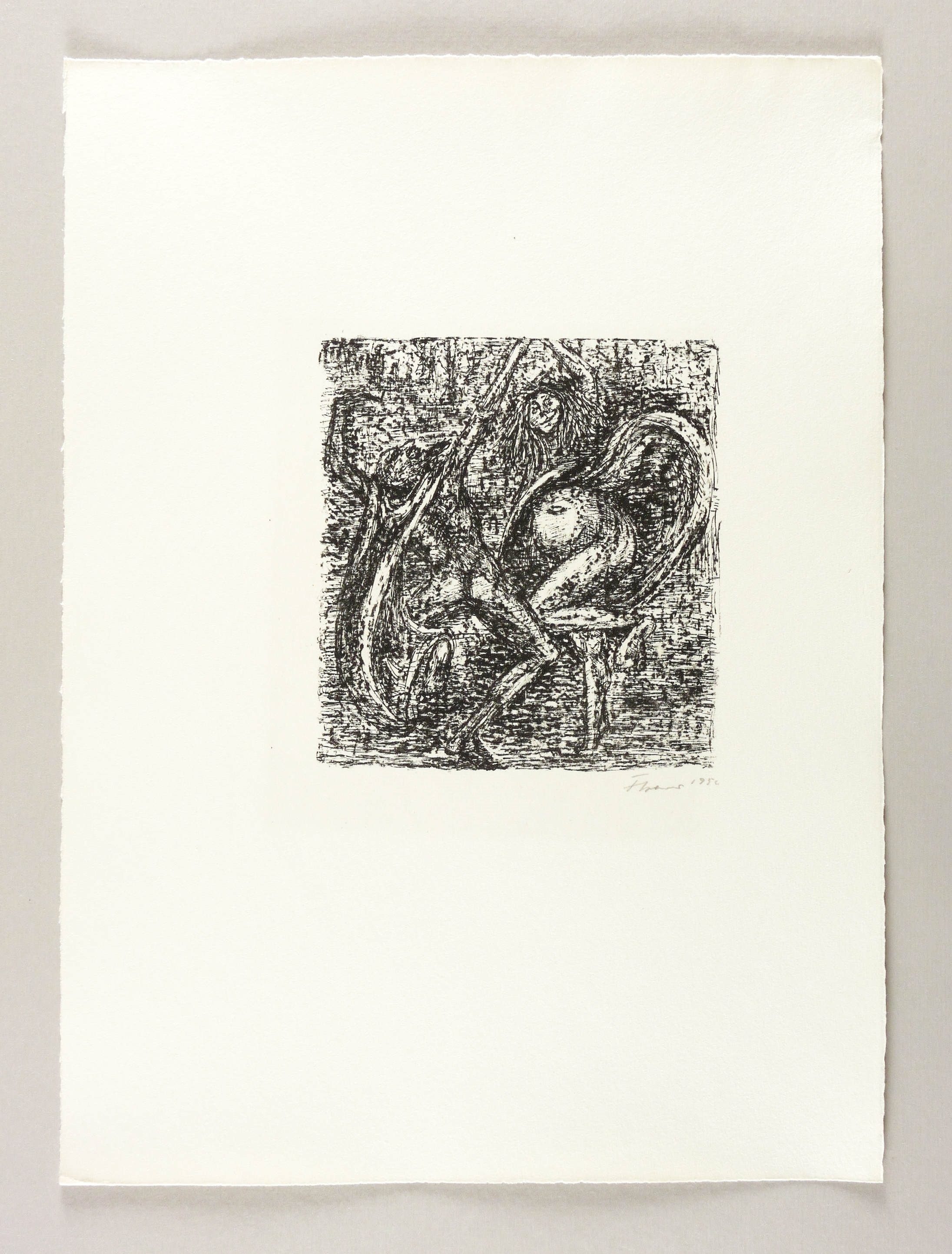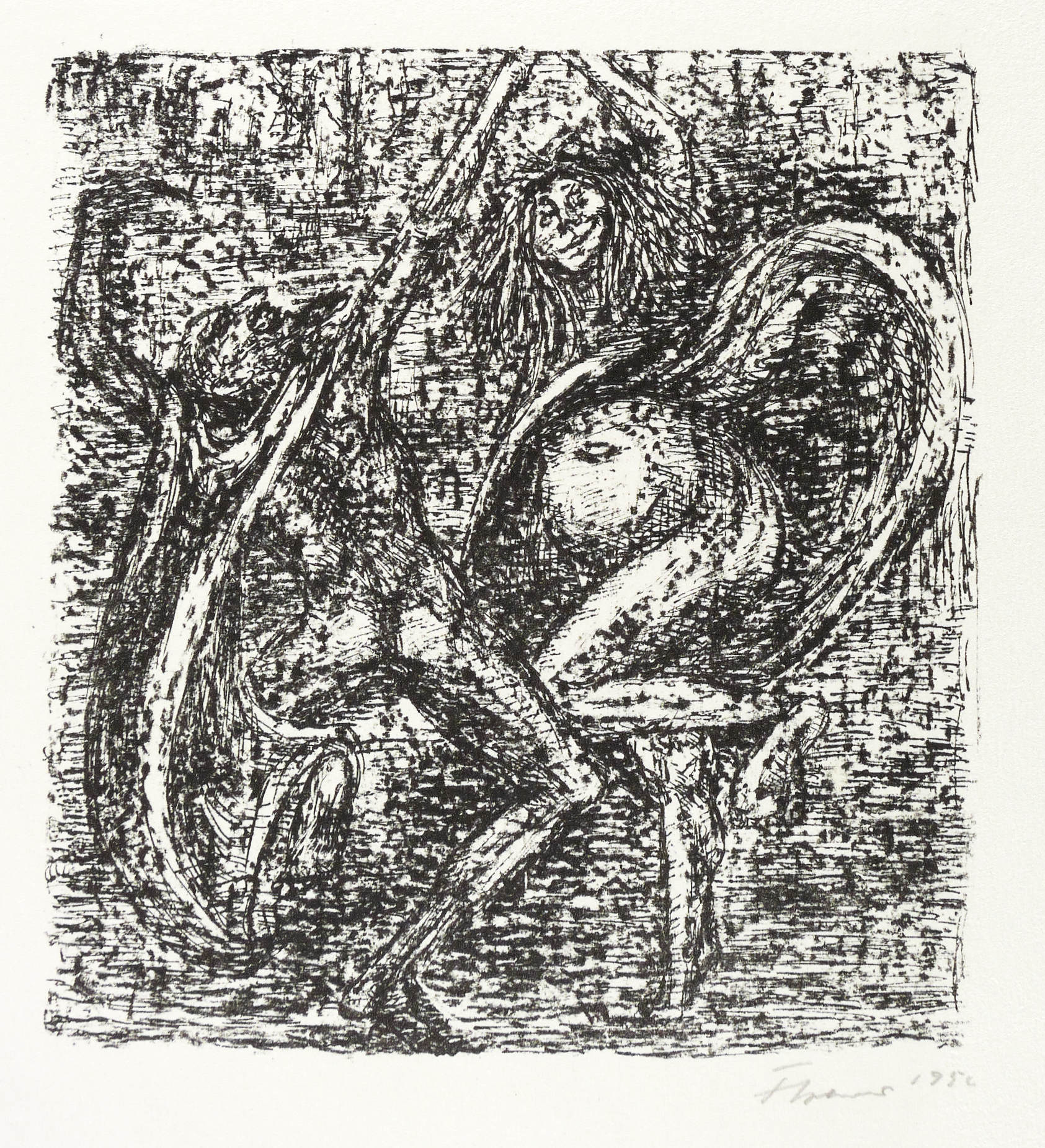 1956. Lithografie / Kreide- & Federlithografie, in Schwarz, auf leichtem hellchamois Velin. – Originale Künstlergrafik, von Fritz Cremer. – Auflage 50 Exemplare. – 16,9 x 15,8 cm (Darstellung / Druckbild), 44 x 32 cm (Blatt).